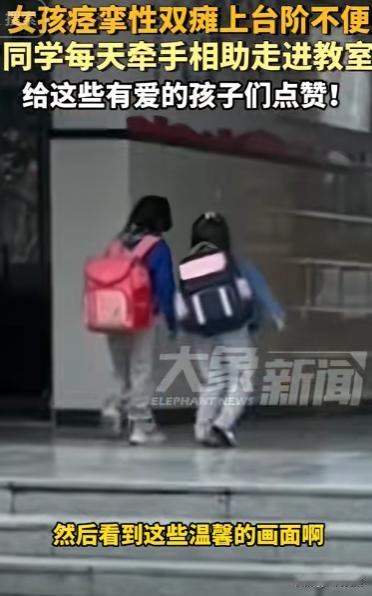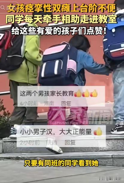 看哭了!幼儿园女孩患有痉挛性双瘫,上学上台阶成了难题,女孩妈妈特别担心,不料同学们都特别暖心,每天都牵手帮助她走进教室,网友:孩子就是一张白纸,你教给他爱就会收获爱! 李女士(化名)的女儿是不幸的同时又是幸运的,因从小患有痉挛性双瘫,在别的小朋友学会走路后,活蹦乱跳的年纪,女孩却只能小心翼翼的慢慢走路,就连普通的小台阶都成了难以跨越的鸿沟。 李女士特别心疼,竭尽全力陪伴女儿帮她康复,可眼看到了上幼儿园的年纪,李女士想要女儿和别的小朋友一样接受教育,但又担心女儿上学不方便,更担心以后上小学可咋办。 不料在送女儿去幼儿园后,班级里小伙伴以及老师的举动,令她悬着的心终于放下了。 只见每天女儿上学在上台阶的时候,无法登上去,周围并没有小朋友对其嘲笑,反而小朋友们都特别善良,每天牵手帮助女孩踏上台阶走进教室,老师也特别体贴还专门安排小朋友帮助女孩,李女士特别感动,就将视频发到了网络上。 网友:“孩子就是一张白纸,你教给他爱就会收获爱!” “这个应该感谢老师!老师有正确引导非常关键” 来源:大象新闻