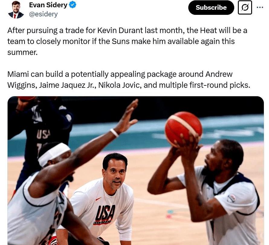热火和火箭都盯上他了。热火据说打算用维金斯、哈克斯、约维奇,再加上一堆首轮签去换。火箭呢,据说乌度卡教练对杜兰特那是相当欣赏。