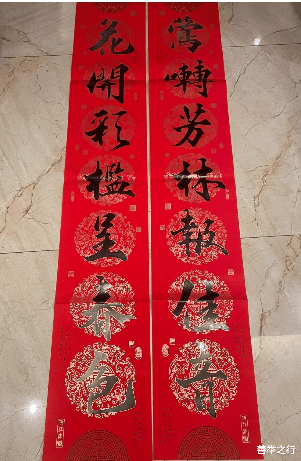 书法创作与内容: 老年志愿者们挥毫泼墨,笔力遒劲,春联内容紧扣时代脉搏,如“喜居宝地千年旺,福照家门万事兴”“年年顺景财源广,岁岁平安福气多”,既有传统吉祥寓意,又融入对幸福生活的期许。他们或专注凝神,或相视微笑,将祝福倾注笔端,红纸黑字间洋溢着对中华优秀传统文化的传承与热爱。
