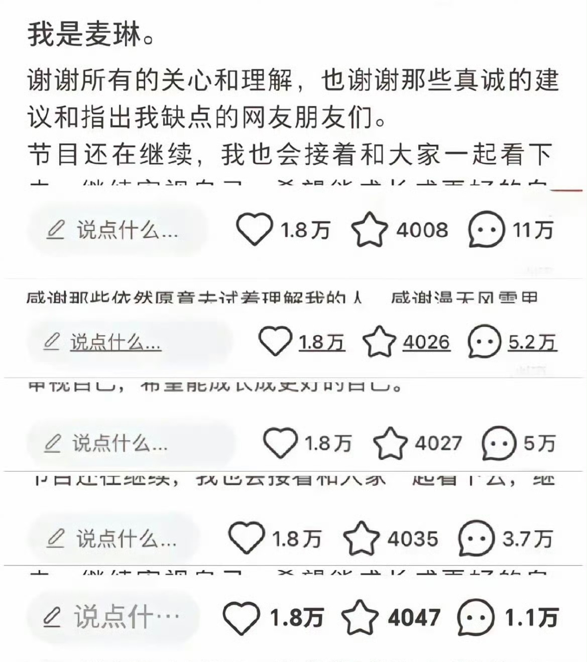 麦琳除了带孩子、做家务、照顾李行亮的工作和生活,从此之后又多了一个工作——删评论! 从11万个评论删到了不到1万个评论,都是骂她的吧? 麦琳怎么有勇气发帖呢?她以为有人会支持她吗?谢谢关心和理解?