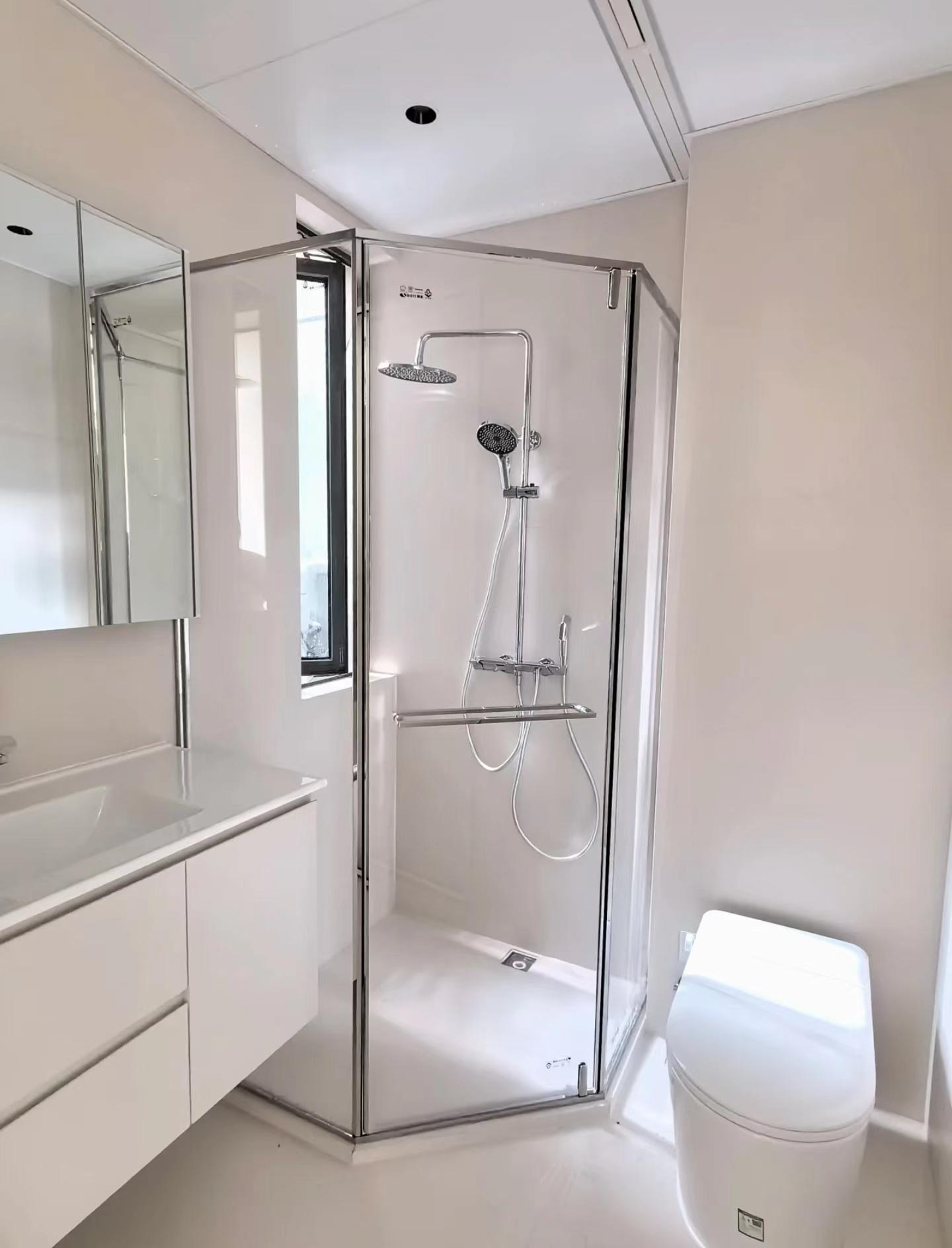钻石形淋浴房巧妙嵌入墙角,既优化空间利用,又确保了活动通道的宽敞,是小空间设计的理想之选,高效节约每一寸宝贵区域。