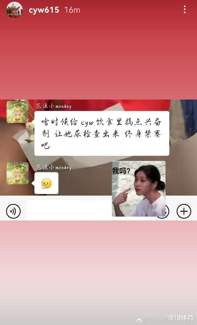 陈艺文还晒出了一条聊天记录,“啥时候给cyw(陈艺文名字缩写)饮食里搞点兴奋剂,让她尿检查出来,终身禁赛吧!”