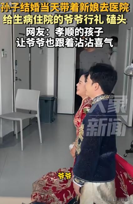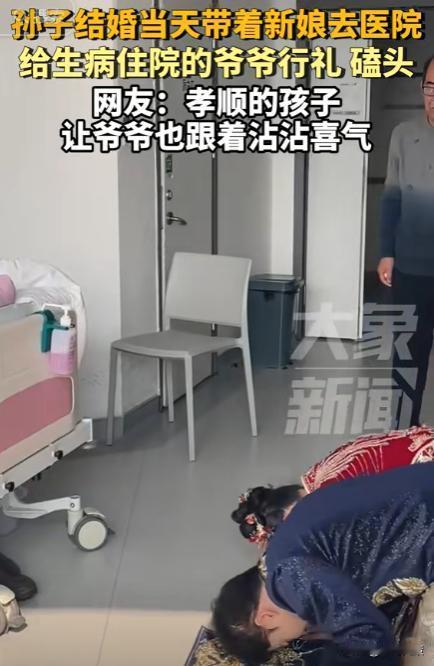 看哭了!河南,一男子举行婚礼,但爷爷因生病卧床无法参加,本以为会遗憾终生,谁曾想,男子当天竟带着新娘一起去医院,在病床前给爷爷行礼磕头,爷孙几个泪流满面,网友;孙媳妇一改口,爷爷的病都好了一半啦! 男子林先生(化名)前段时间举办了自己人生中重大的婚礼,可谓是意义非凡,但遗憾的是,婚礼举办之前,爷爷就生病住院,需要好好疗养,无法亲自去现场参加婚礼,见证孙子和孙媳妇的幸福。 对此林先生有些失落,就在这个时候,他想到了一个点子,规矩是死的但人是活的,既然爷爷来不了,为什么自己不能去找爷爷呢。 因此在婚礼当天,林先生在进行完一些流程后,不是第一时间去酒店,而是带着新娘来到了医院,对着病床上的爷爷行礼磕头。 随后新娘更是正式改口,跪在地上幸福的表示:“爷爷,爷爷好,祝爷爷长命百岁!”病床上的爷爷看到这一幕脸上露出了幸福笑容的同时,也顺势回应孙媳妇,眼眶中也充满了泪水,这一刻孙媳妇正式进了他们家的门。 随后孙子和孙媳妇来到病床便守着爷爷,爷爷即便无比虚弱,也伸出手来握住孙媳妇,脸上一直洋溢着笑容,孙媳妇看着病床上的爷爷,不自觉的落泪,随后顺势用床上的毛巾擦去眼角的泪水,最后三人进行了一个充满意义的合影。 这个视频发到了网络上,看哭了无数网友,大家纷纷给予祝福;“孙媳妇一改口,爷爷的病都好了一半啦” “瞬间泪目了,多懂事的孙媳妇,希望这位爷爷早日康复” “年纪大了看这样视频泪流满面” 来源:大象新闻