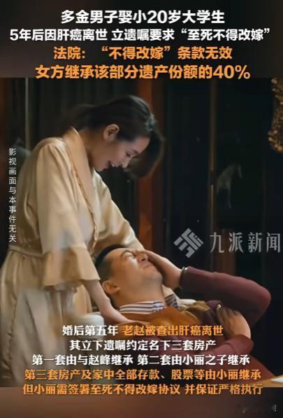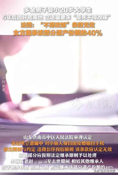 山东济南,多金男子娶妻后不久患上肝癌,去世前特意立下遗嘱,要求妻子“至死不得改嫁”,否则不能继承遗产,妻子将去世的男子及其儿子告上法庭,要求不限制自己婚姻自由,法院判了! 男子赵先生(化名),是一个典型的成功人士,但每一个成功男人的背后,都有一个同甘共苦的女人,那便是他的第一任妻子,俩人能力旗鼓相当,为了各自的事业而拼搏奋斗,经过几年的努力,俩人成功打下了属于他们自己的江山,成功跻身富豪家庭。 并且迎来了爱情的结晶,共同养育儿子赵峰(化名),本以为有了钱以后,一家三口的生活多姿多彩,肯定无比幸福,但现实是骨感的,赵先生和妻子因为感情上的不合,最终选择了离婚各自安好。 离婚后对共有财产进行平等分割,俩人毫无怨言,和平离婚。 后来没过多久,赵先生迎来了人生第二春,在工作中认识了一个比自己小将近20岁的女大学生小丽(化名),小丽年轻漂亮还有能力,很快就吸引了赵先生的注意,对其展开了猛烈的追求,小丽也没受得住多金男的攻势,爱上了赵先生,最后俩人走到了一起。 并且步入婚姻的殿堂,婚后俩人也生下了属于自己的儿子,可是好不容易重新获得的家庭生活,还没有维持几年,五年后,赵先生就被查出了肝癌,他深知自己命不久矣,于是就提前立下了遗嘱,里面清清楚楚的写着财产的分配,他将名下的三套房子,一套给了大儿子,一套给了小儿子。 而最后一套以及家中的其余财产,交给小丽继承,但是有个前提,那就是小丽之后到死也不能改嫁。 如果不能执行,财产将另有安排,后来赵先生去世,小丽在看到遗嘱时有些心寒,在她看来自己在赵先生生病期间付出最多,为何赵先生要以爱之名进行绑架呢,因此他不认同遗嘱,一气之下将赵先生和赵峰都告上了法庭。 要求不能限制自己的人身自由,且按照遗嘱分割遗产,对此赵峰坚决反对,在他看来父亲既然白纸黑字写有规则就应该按照规矩来,如若小丽不同意,干脆按照法定的继承原则重新分配。 最终,法庭经过多方考虑按照法定继承原则分配,因为赵先生遗嘱中限制妻子婚姻与人身自由的内容有悖公序良俗,故而不予认可此条款。 而分配多少,法院也根据家人对家庭以及赵先生的贡献算,是小丽付出的最多,因此给予了她其余遗产的40%。 来源:九派新闻