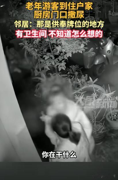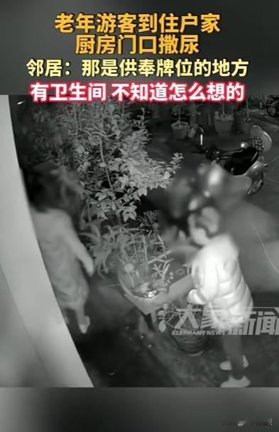 太没素质了!云南,一老年游客有卫生间不上,反而到一住户家厨房门口撒尿,旁边还有一大妈帮着放哨,住户邻居发现,上去就是质问:你在这里干什么,这是人家供奉牌位的地方。网友:反正人是不会随地大小便的。 一大叔和家人来到云南旅游,一玩玩到晚上,途中大叔想要上厕所,就来到了周围一个卫生间,不料里面有人,大叔理应在外面等,毕竟多等一会也不耽误啥事情,谁曾想他下意识并不是等待,而是走到前面,去人家一住户家的厨房门口进行方便。 跟随他一起过来的同伴竟然并没有觉得这有什么不妥,而是主动给她放哨,俩人本以为这么神不知鬼不觉的就能够没素质的处理完内急,谁料刚好被住户的邻居看到,当即上前阻止,放大嗓门呵斥他们,引来了主人家的注意。 主人家要过去看情况结果被女子拦着不让过去,更令人气愤的事,那边是人家供奉祖先牌位的地方,换了谁都无法接受。 网友:“反正人是不会随地大小便的。” ‘旅游可以,但是一定要提升自身的素质啊!在国外就有好多老年团的素质……不说了怕被喷’ 来源:大象新闻