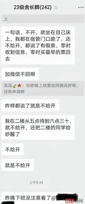 跪门口都没用!11月25日一学生深夜突然接到家人危重消息,买了早晨7时30分的机票回家。没想到,宿管阿姨竟要求必须要有学工部的批文。学生回答说没有,宿管阿姨就坐在椅子上,坚决不开门,一直让学生从凌晨5时待到6时30分,导致学生“飞机没赶上,最后一面没见上”。