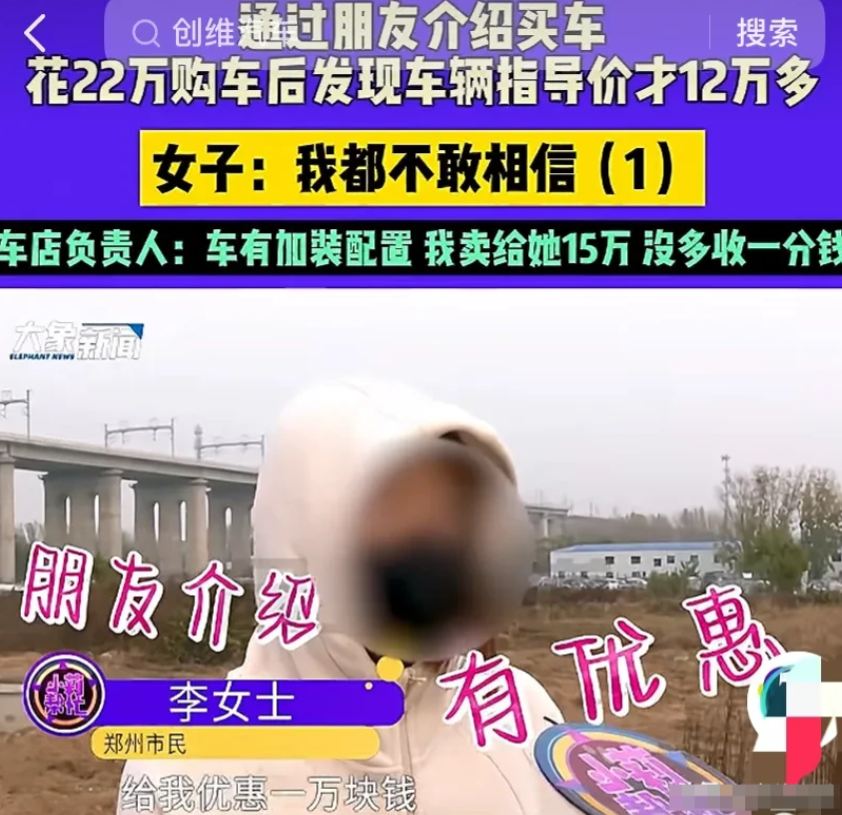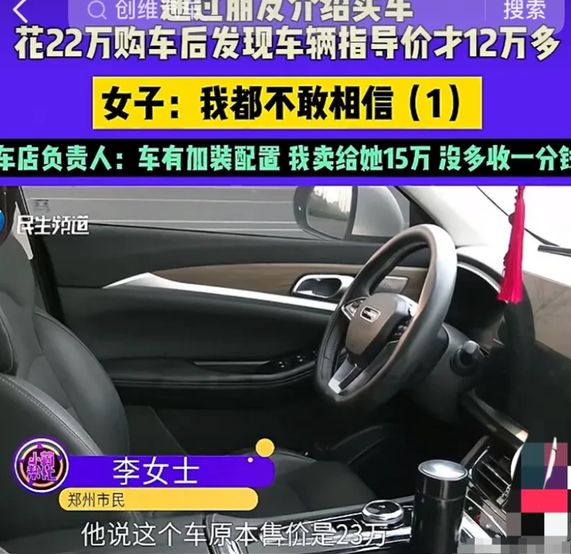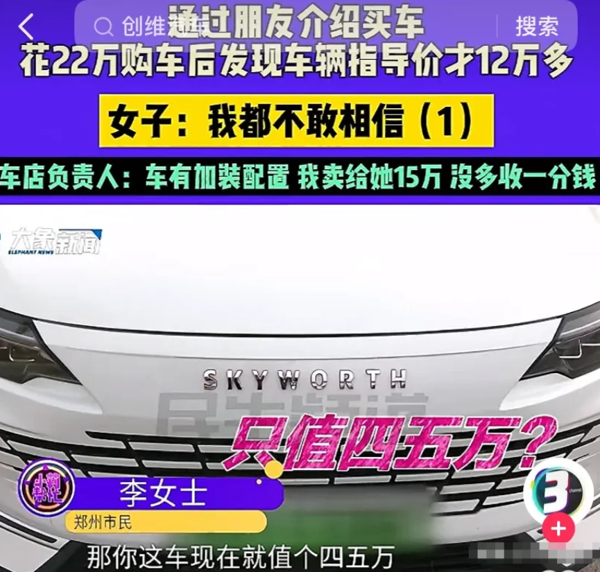 河南郑州,2024年1月一女子声称经朋友介绍花22万元购买了一辆创维汽车,开了10个月后,去卖车时,发现新车指导价才12万元。女子直呼上当受骗!向记者求助。然而听了女子朋友、车商的说法,不少网友反而觉得有车商被设计! 李女士在朋友的介绍下,在二手车市场看中了一辆创维汽车。车商告诉她,这辆车的原价是23万元,但因为一些优惠,她可以以22万元的价格购买。李女士被这个价格所吸引,尽管她对车市并不熟悉,但她相信朋友的话,决定购买这辆车。 车商为她办理了10万元的车贷,而她自己则支付了12万元的首付款,高高兴兴地将车提回了家。然而,10个月后,当李女士想要卖掉这辆车时,她被告知车辆的估价只有4、5万元。 这一消息让她感到震惊,她立刻上网查询,发现这款车的新车指导价仅为12.98万元。李女士感到自己被欺骗了,她的情绪变得激动,决定揭露这个真相。 在与朋友的沟通中,李女士希望得到帮助,但朋友的回应却出乎她的意料。 朋友表示会与车商协商解决问题,但私下里,他却有着自己的小算盘。车商声称,车辆因为加装了一些配置,实际价值为15万元,并提供了一张发票作为证明。 随着李女士与车商的冲突升级,车商解释说,他们之所以将6万元转给了李女士的朋友杨某,是因为这是杨某作为介绍人的提成。杨某也确认收到了这笔钱,但对于这笔提成的解释却含糊其辞。 李女士质问杨某为何没有告知她关于提成的事情,杨某的回答让人震惊,他表示自己没有考虑到要告诉李女士,但背后可能有着更深层次的动机。 记者的深入调查揭示了车商和杨某之间可能存在的复杂利益关系。当记者询问杨某是否愿意退还6万元给李女士时,杨某的拒绝引发了争议。 法律专家分析了这个案件,指出根据《价格法》第14条第4项的规定,价格欺诈是被禁止的,李女士有法律上的选择。同时,根据《消费者权益保护法》中的“退一赔三”原则,李女士有可能获得赔偿。 事件引发了网友的热议,李女士和车商都报了警,舆论风暴愈演愈烈。 网友们对事件有着不同的看法和猜测,形成了一场舆论风暴。李女士的主张与车商的证据之间存在着矛盾,真相似乎扑朔迷离。李女士对朋友杨某的态度和行为感到疑惑,悬念重重。事件的真相需要进一步的调查来确定,但新的证据随时可能出现,为这场戏剧性的事件增添更多的不确定性。 参考资料:威海新闻网——2024-11-26 08:42《【#朋友介绍22万买车指导价才12万多#女子:都是朋友,于心何忍?】》