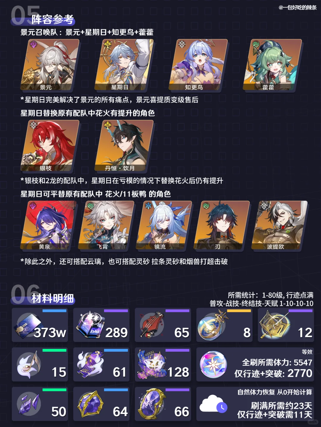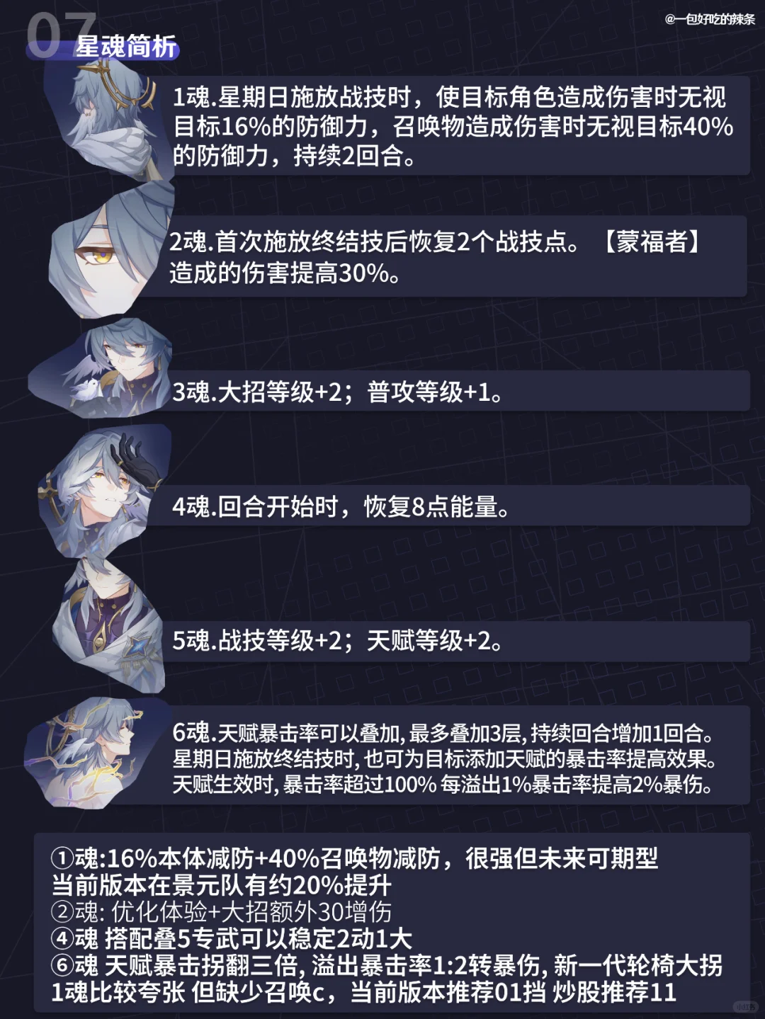 大家好,这里是辣条~ 本期是星期日的培养攻略~ ————————————— 如有遗漏/错误欢迎指出,共同进步~ 最近新玩家/回坑玩家多,大家友善讨论哦~ ————————————— 辣条对星期日的简评:召唤体系的核心辅助,当前版本在亏模 不考虑召唤物的情况下,仍有超越其他单体拐的辅助能力,而且更是能把开服老c景元抬到2.0主c的水平 崩坏星穹铁道 崩坏星穹铁道创作者激励计划 星期日 星穹铁道星期日 星穹铁道攻略 星穹铁道配队