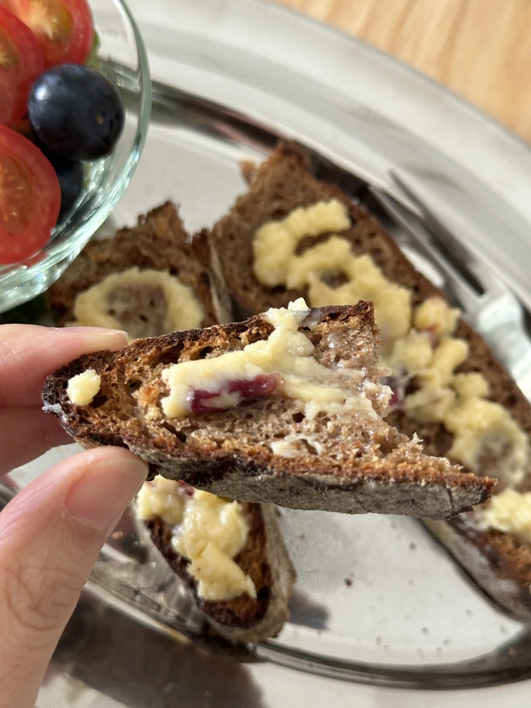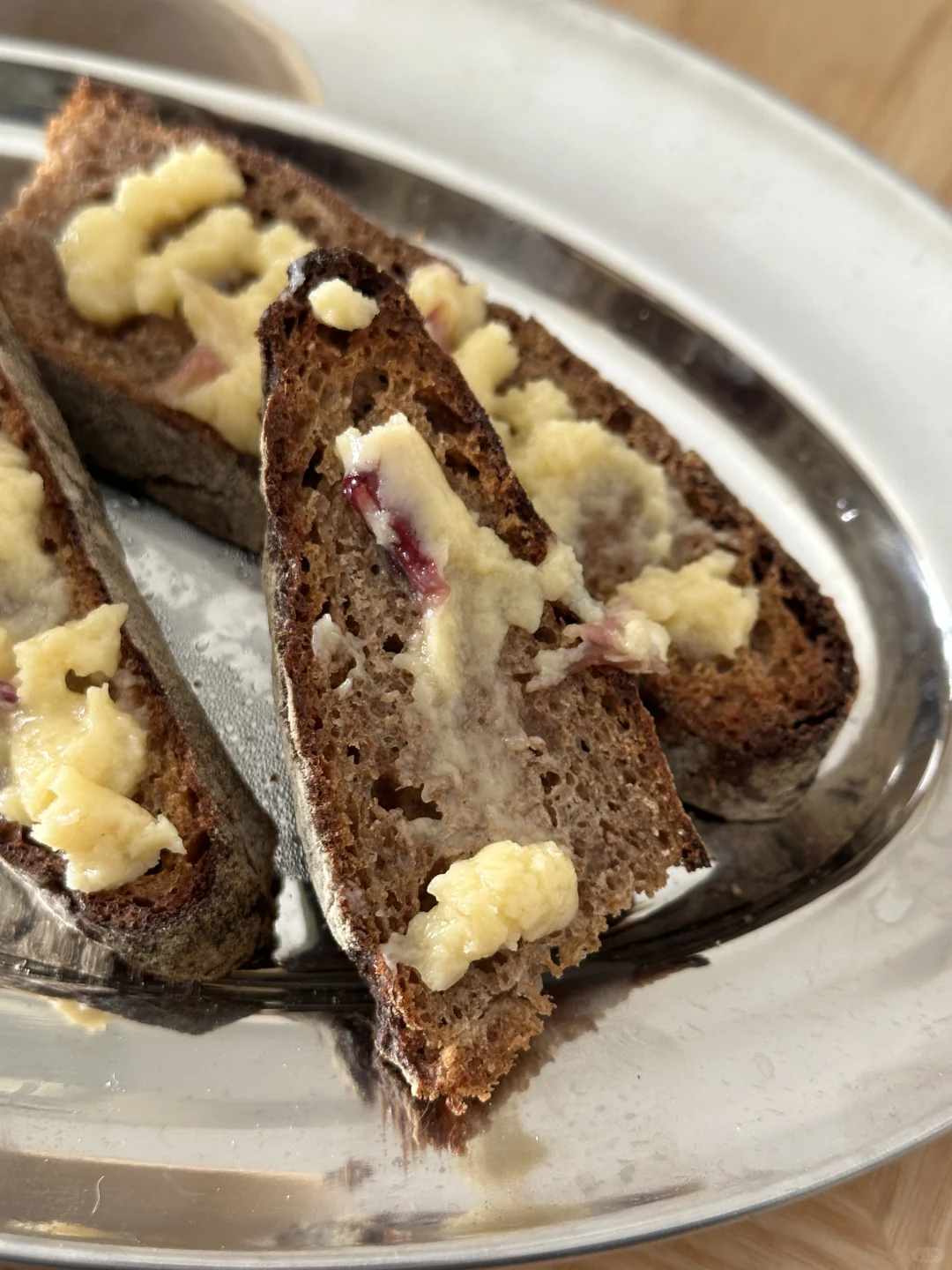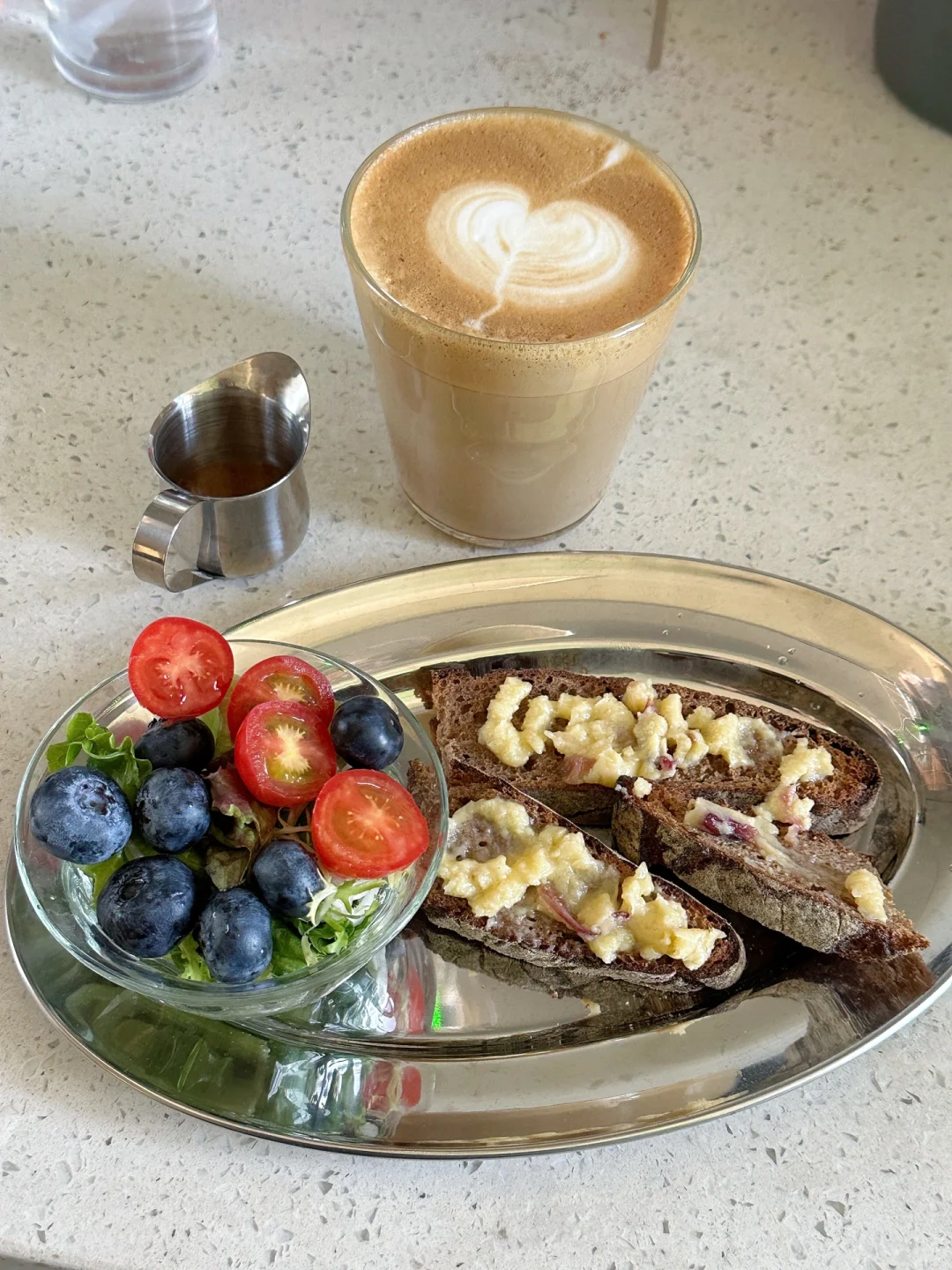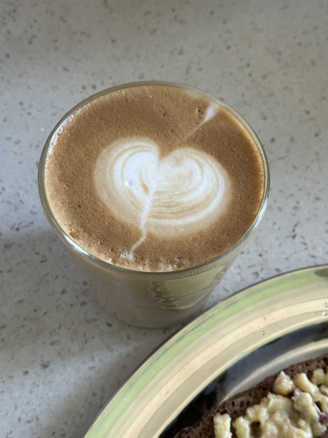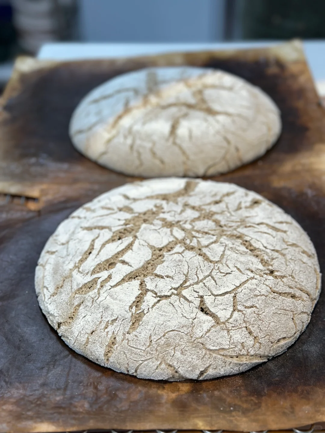 6天学习面包都带走、除了寄给朋友、自己也存了一些、大饼子纯黑麦硬欧回到家才尝、配奶酪很惊艳、酸味明显、复烤后外壳酥脆里面湿软!是喜欢的口感! 早餐 纯黑麦欧包+玫瑰花🌹酱奶酪格外的搭配 咖啡拉花继续努力中 最近天气太好!🐱睡得太香了