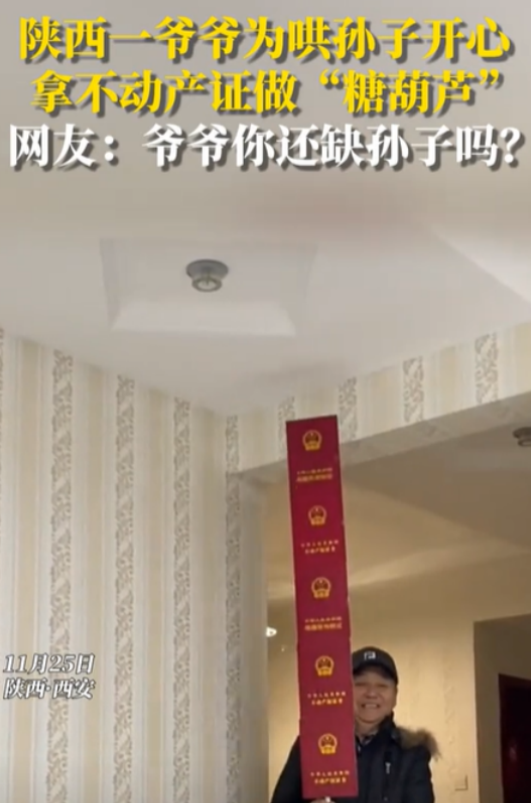 爷爷用5本房产证做“糖葫芦”!2024年11月25日,陕西西安,孙子因工作不好找