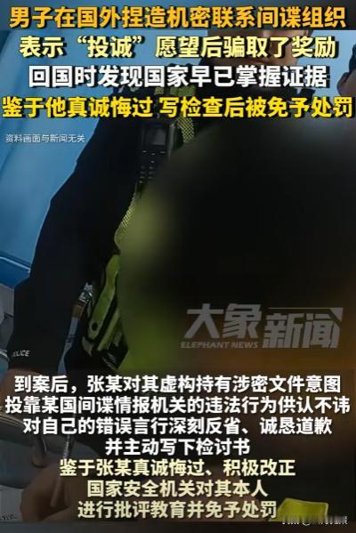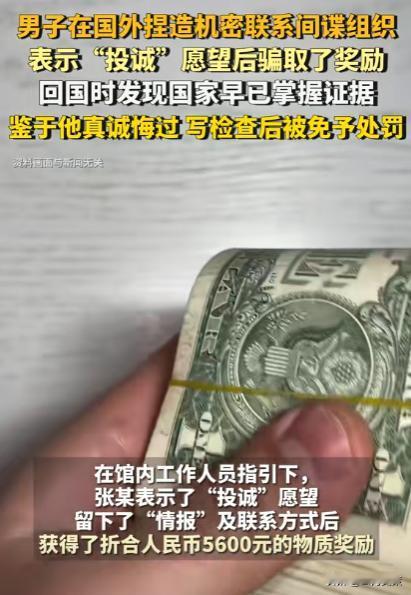 外国间谍组织被我国一名男子耍了,这名男子在国外伪造了许多机密文件,假意投诚,骗得了某国间谍组织的信任,还获得了5600元的物质奖励。本以为天衣无缝,回国时却发现国安部门已经掌握了他投靠国外间谍组织的行为,结局如何? 男子张先生是个狠人,为了赚钱,什么狠事都能干出来,不管后果怎样,于是就靠着这股天不怕地不怕的冲劲,道听途说某国淘金赚钱,从没考虑事情的真实性,说干就干,出发来到了某国,本想靠着别人口中的淘金大赚一笔,结果到了当地后才发现自己是被骗了。 原来因当地政府大力整顿矿山开采,导致干淘金的都是底层的劳动者,工作艰苦不说,关键是工资还不高,这淘金梦就在这瞬间破灭了。 但是来都来了总不能白来吧,先干着赚一点是一点,可是赚的那点钱根本满足不了他,于是他就想到了一个好办法,干脆假冒间谍,主动像当地的间谍组织投诚,谎称自己手里面有很多机密文件,为了让对方相信,他整的神神秘秘的。 为此他亲自来到了当地史馆找工作人员联系,并交给了他们自己率先专门准备的字条,上面用翻译出来的英文写着如有需要就联系自己。 不曾想这一招还真管用,成功骗取了当地间谍机关的信任,甚至还给了他5600元的奖励,张先生特别兴奋,殊不知他所做的一切,早就被我国国安部门发现,掌控着他全程的行为,就等着他回国接受处罚了。 毫不知情的张先生在拿到奖励后,就果断放弃淘金生涯,选择回国,结果刚下飞机,就被逮捕。 经过审讯,张先生供认不讳,主动承认自己所作所为的一切动机和原因,并且承认自己这样的错误,诚恳的写下悔过检讨书,最终因知错就改,认错诚恳,国家安全机关对他进行了批评教育,就放他离开了。 希望张先生能够改过自新,不要为了赚快钱而走上歪门邪道,在正道上一步一个脚印平稳的向前走,才是王道! 网友辣评:此故事可以拍成电视剧、碟中谍 来源:大象新闻
