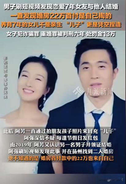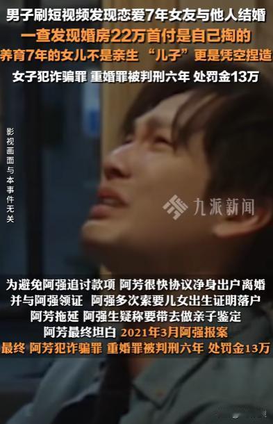 太炸裂了!江苏,男子刷视频发现小11岁妻子与他人举办婚礼,并且自己养育7的女儿不是亲生的,就连“儿子”也是凭空捏造的,甚至与他人购买婚房的首付款22万也是自己的,男子一怒之下将妻子告上法庭,结局如何? 男子阿强(化名)是个特别拼命工作的工作狂,因为工作所需,平常需要到处出差,安无定所,导致连个对象都没有,眼看着自己的年纪越来越大,到了谈婚论嫁的年纪,可是却一直没能遇到喜欢且合适的人。 直到2014年,他在网上认识了小自己11岁的小芳(化名),起初两个人只是在普通不过的朋友关系,一直充当着双方的心灵慰藉,每当工作烦心之时或者是无聊的时候,俩人就会聊天,袒露一些最近的烦恼,互相安慰。 就这样俩人谈起了恋爱,因阿强工作地点不固定,所以他们一直都是网恋,在网络上了解双方的家庭情况和背景,那个时候,阿强一直以为阿芳就是如她口中所说白富美,父亲是大老板,年入百万,自己是个富二代根本不差钱的样子。 让阿强觉得阿芳和自己在一起一定是喜欢自己,不可能别有用心,殊不知阿芳在和阿强网恋的时候就已经和扬州的一个男友同居在了一起,后来她在阿强出差回来又和阿强在宾馆约会。 后来阿芳怀孕了,孩子并不是阿强的,但是她却谎称是阿强的,并且在孩子出生后,告诉阿强之所以提前三个月出生是因为自己有胆结石,药物催化导致的。 阿强天真的信以为真,并且把女儿当做自己拼命赚钱的全部动力,更是把大部分时间花在出差和工作上面,和阿芳见面的日子屈指可数,这就给了阿芳很多机会,搞别的恋情,后来阿芳再次怀孕,但是这一次是宫外孕,孩子根本留不得,但此时阿强知道,还以为肚子里的事是自己的孩子,实际上就连阿芳自己都不知道到底是谁的孩子。 随着肚子越来越大,阿芳瞒着阿强流产了,并且还谎称自己给阿强生了个儿子,人在外地的阿强也没办法辨别真假,只知道阿芳会发儿子的照片给他看,实际上照片里的小孩竟然是阿芳朋友的。 之后阿芳一直以孩子为由问阿强所有钱财,阿强每次都是大手一挥,可是他不知道的是,阿芳问自己要的钱,全部用于他和新男友结婚婚房,二人于2019年结婚,用阿强加起来有二十二万之多的钱付首付。 而血包阿强一直被蒙在鼓里,自己拼了命干活,结果赚来的钱是在给别人养媳妇,别人养孩子,别人买房子。 直到有一天他刷短视频的时候,意外发现了阿芳的另一层身份,他感觉自己受到了欺骗,随后为了不打草惊蛇,私下进行调查,发现这一切惊天秘密。 随后找阿芳质问,起初她还不承认,直到阿强要求做亲子鉴定,阿芳才全盘托出,并且为了防止阿强化要回财产,赶紧和丈夫离婚自己净身出户。 得知真相的阿强几乎崩溃,势必要让阿芳付出代价,于是一气之下,在2021年将阿芳告上了法庭,法庭经过评审,判定阿芳诈骗罪,重婚罪。 阿芳也因此被判刑六年,上交罚金十三万。 此案件一出,不少人吐槽,这种剧情都可以拍个电视剧了!编剧都不敢这么写! 还有人表示:艺术来源于生活,但是艺术已经无法超越生活! 来源:九派新闻