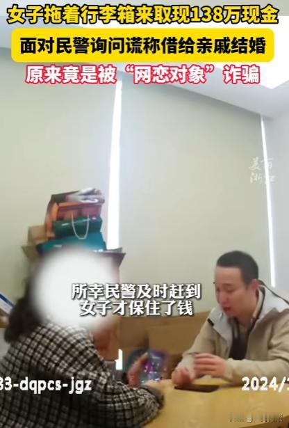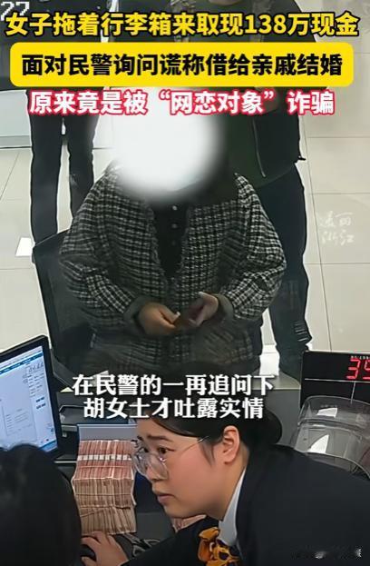 宁波,一女子拖着行李箱去银行取138万现金,要给网恋对象做投资,好在反诈民警及时赶到,面对质问,女子还谎称是借给亲戚结婚,结果在民警追问下才袒露事情,殊不知自己被网恋对象诈骗!网友:这头脑是怎么可以赚到这么多钱的? 李女士(化名)是个富婆,家里有着百万存款,因此她生活的十分惬意,这天闲着无聊在网络上找人聊天,聊着聊着,感觉和网上一名男子特别志同道合,俩人就发展了情侣关系,展开了一场网恋。 李女士深陷其中,一直觉得网恋对象是爱自己的,殊不知这个网恋对象就是个彻头彻尾的骗子,就是为了她的钱而接近她,用一些花言巧语博取李女士的信任,甚至和她建立关系,为的就是最后骗取李女士的百万存款。 但李女士却并没有意识到,所以俩人恋爱的时候,男子还和李女士谈起了投资,表示自己有一个稳赚不赔的项目,美其名曰的带着李女士赚钱,其实就是等着李女士 给钱,他立马跑路。 结果李女士还真的信了,第二天就去银行取存款,一下子取出一百三十八万的现金,引起了银行以及反诈民警的注意。 大家意识到,李女士一定是被诈骗集团洗脑了,但李女士却十分谨慎,取完钱就想要赶紧离开,还好民警及时赶到,询问李女士取这么多钱干嘛,李女士却还谎称是给家里亲戚借的结婚彩礼钱,说着还说不行,我让他自己来取。 演的还比较逼真,不过好在民警继续追问下去,李女士顶不住压力才袒露的心声,原来是网恋对象做投资用的。 民警经过沟通教育,让李女士明白了自己是被诈骗了,还好民警及时阻拦,不然她的一百多万都打水漂了! 这年头诈骗方法千奇百怪,大家一定要擦亮双眼,谨防诈骗!
