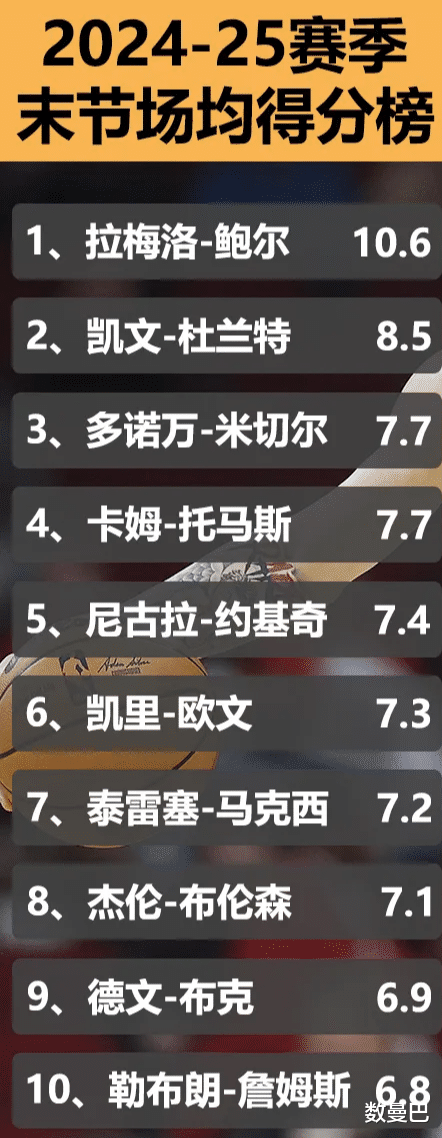 场均贡献30.4分5.3板7.5助1.4断这完全就是巨星级别的表现啊!更可怕的是,他关键时刻的更加稳定本赛季,鲍尔前三节的中率为39.2%到了第四节,他投篮命中率为49.7%整整上升了10个百分点,恐怖如斯!他第四节场均砍下10.6分,断层第一前三节划划水,第四节发力收割比赛这不就是老詹上了年纪之后的打法吗鲍尔年纪轻轻就已经学会了这种打法这小子,前途无量啊!未来是你的!