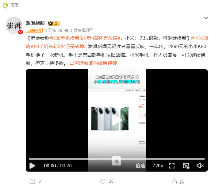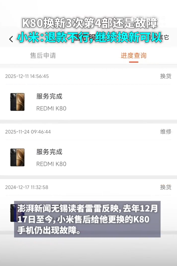 2025年12月16日,据澎湃新闻报道,近日,无锡消费者反映,花费2899元购买的小米K80手机在一年内连续更换三次新机后,到手的第四部手机仍出现故障。