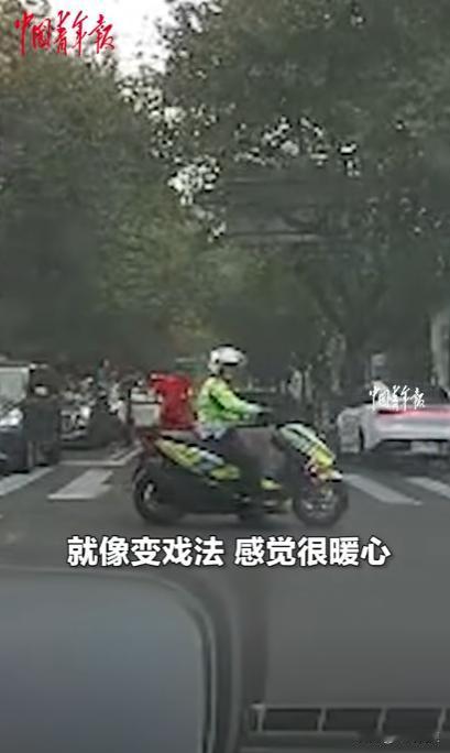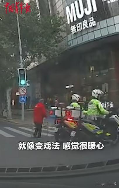 这俩交警太帅了!上海,一位老人拄着拐杖通过路口,因行动不便刚出发绿灯就变红,就在周边有车辆蠢蠢欲动的时候,突然冒出来两个骑摩托的交警,为老人保驾护航,送到了路对面。网友:这就是执法的温情! 男子林先生(化名)这天开车出门办事,路过一个红绿灯路口的时候,因红灯就停下来等绿灯,结果看到一位穿着红色衣服的老爷爷,因年纪大了行动不方便,独自一个人拄着拐杖缓慢的在斑马线上行走。 可是放在老爷爷的视角上,他刚出发没多久,其他行人都纷纷走过,可他才走过三分之一,走到一半,原本的绿灯变红。 而林先生等来了绿灯,看到老爷爷还没走完,他十分自觉的放慢车速,打算等老爷爷过了路口再出发。 他周边的很多车辆都停下来等待,但还是有些车辆可能因为有急事,就蠢蠢欲动,就在这个时候,两名骑着摩托车路过的交警看到了这一幕。 他们没有商量,也没有犹豫,直接右拐,跟着老人行走的速度,一点一点的护送老人走到了马路对面,期间还做出了阻拦的手势,避免有车辆没有眼色。 这一幕刚好被一旁等待的林先生看到并且被行车记录仪拍摄到,当时的他深受震撼,感觉交警跟变戏法一样,突然出来为老爷爷保驾护航那一幕实在是太帅了!同时也感觉到无比的暖心。 后来他就将这段暖心的视频发在了网上,希望能够温暖更多的人,并且呼吁大家遇到老人家过马路的时候,大家都多一点耐心。 网友:这就是执法的温情! 来源:中国青年报