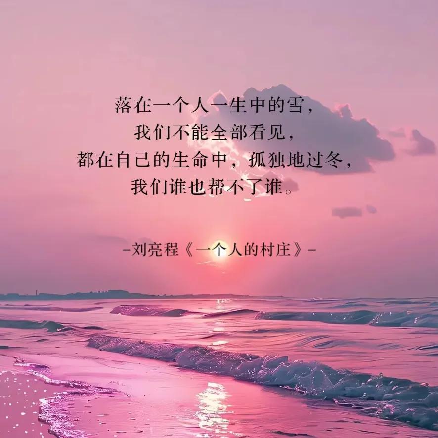 落在一个人一生中的雪,我们不能全部看见,都在自己的生命中,孤独地过冬,我们谁也帮不了谁。 ——刘亮程《一个人的村庄》 文学语录分享