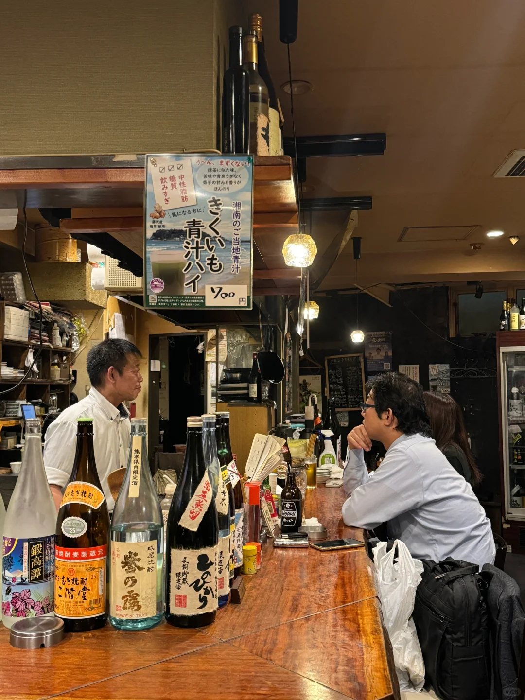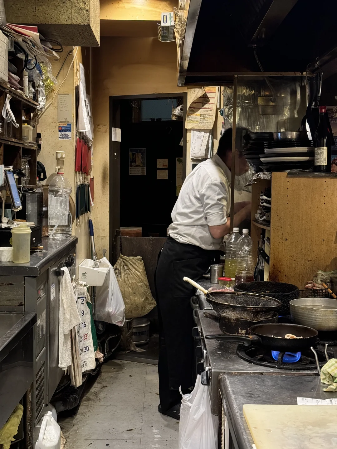 深夜到的东京,直接坐火车去了湘南藤沢(靠近箱根),也没查什么关于餐厅方面的攻略,就直接乱入了一家很隐蔽的餐厅/餐吧,里面真的一个游客都没,连英文菜单都没,每个进来的都认识老板,跟老板聊天,甚至还有自己带酒进来放在店里以后来喝的。店里也只有老板一个人操持!简直就是电影里的“深夜食堂”!!