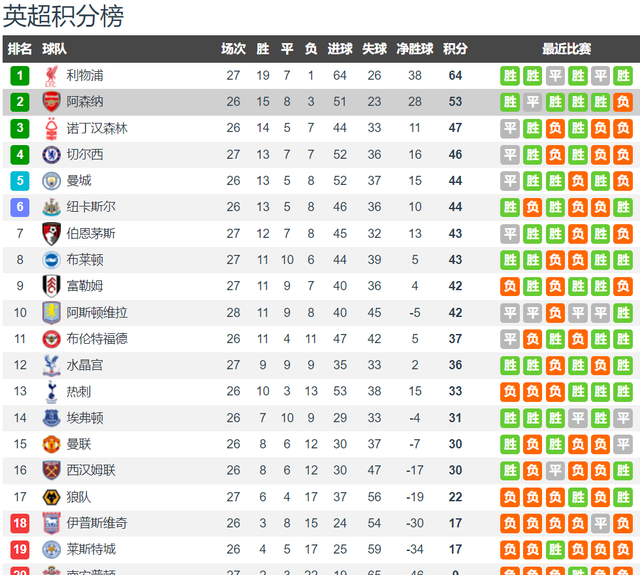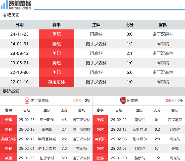 英超26轮过后,诺丁汉森林以14胜5平7负积47分位列第三,而阿森纳则以15胜8平3负积53分位居第二。诺丁汉森林在上轮英超客场3-4惜败纽卡斯尔,近4轮输掉3场,且均为客场;阿森纳则在上轮主场0-1不敌西汉姆联,结束了联赛15轮不败的纪录。阿森纳的争冠希望似乎已经破灭,而诺丁汉森林则急需稳固排名。