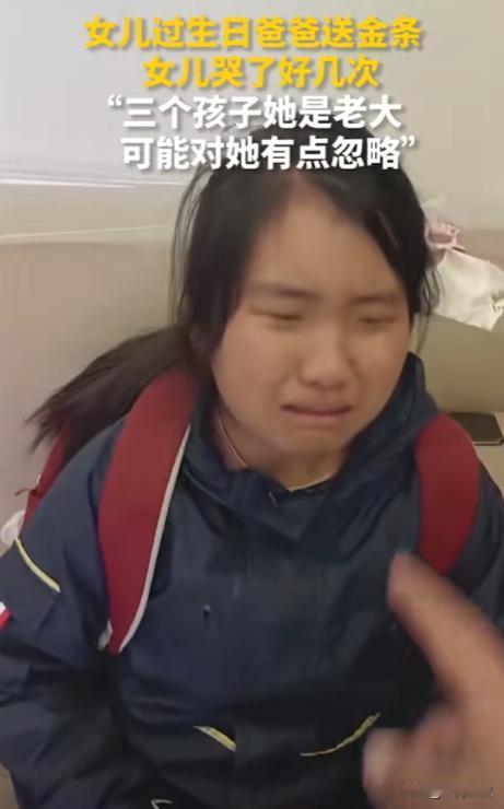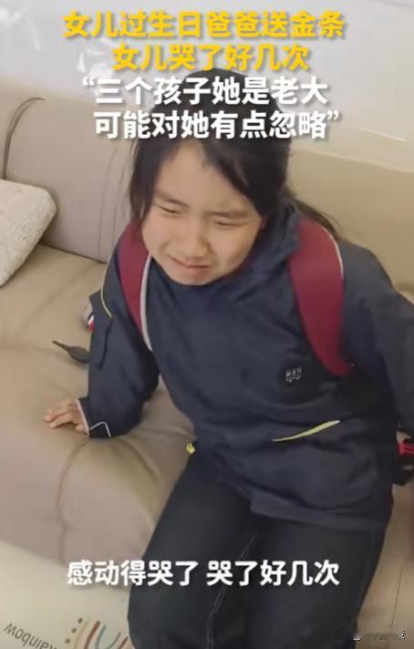 看哭了!河南,女孩过生日,爸爸特地准备生日惊喜,送给她生日金条,女孩放学回家看到后哭了好几次,爸爸解释:“三个孩子她是老大,可能对她有点忽略!”网友:泪水里有委屈有感动吧! 女孩小米(化名)出生在一个普通家庭中,自己出生没多久,还没有好好独享父母的关爱,父母就给他添了弟弟妹妹,家里面一共有三个孩子,弟弟妹妹比自己小,需要父母照顾的多一点,导致她自然而然的少一些关爱。 好在父母都明白自己愧对了小米,对此感到特别的愧疚,希望能尽自己所能弥补一下对小米的关爱,于是在小米今年生日的时候,父亲决定给小米准备一个大大的生日惊喜。 在家里面好好布置了一番,气球LED灯全部准备就位,在家里的电视机旁摆放豪华整齐,电视机上还放着她的照片海报,祝她十一岁生日快乐。 小米放学回到家后,看到父亲为他精心布置的一切,瞬间感动落泪,她一句话也没有说,只是坐在了沙发上,眼泪止不住的流,但脸上却露出甜美的微笑。 父亲看到后为她拂去脸上的泪水,紧接着送给她最后的生日礼物,小米打开一看竟然是一个生日快乐的金条,再次感动落泪! 这段感人温馨的视频被发到了网上触动了很多网友的内心,他们大多数是家里的老大,从小受原生家庭的影响,缺少了很多父母的关爱,因为很多父母意识不到自己对孩子的忽视,如果每个父母都能有小米父母的洞察力,懂得弥补自己对孩子的忽视,或许就会减少很多孩子内心的创伤。 网友评论:“被你的视频感动了,我也是家里的老大,感动的不是因为送金条而是被重视” 对此您有什么见解呢?
