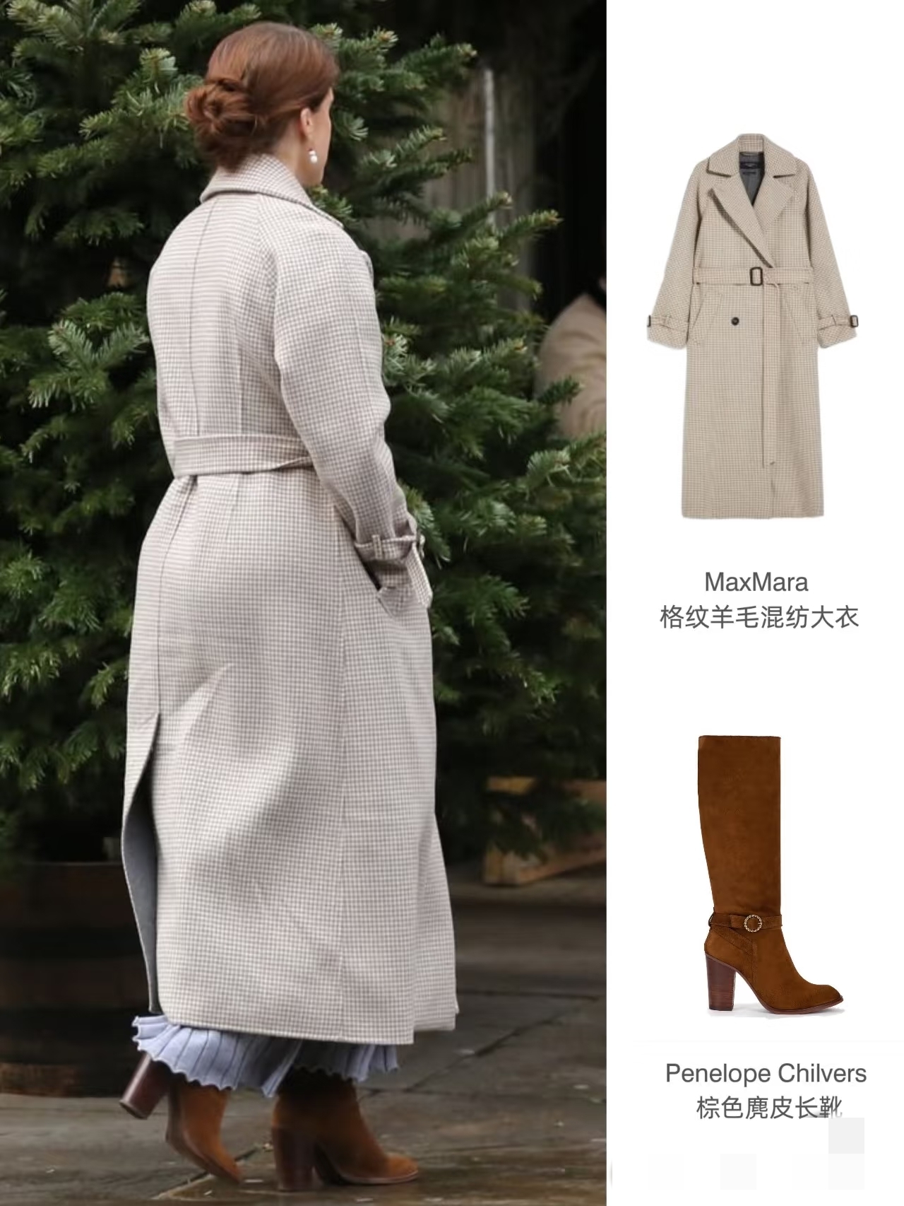 尤金妮公主则是一袭MaxMara家的米白色格纹羊毛混纺大衣,内搭针织长裙,脚踩一双棕色麂皮高筒靴,主打一个简单低调。