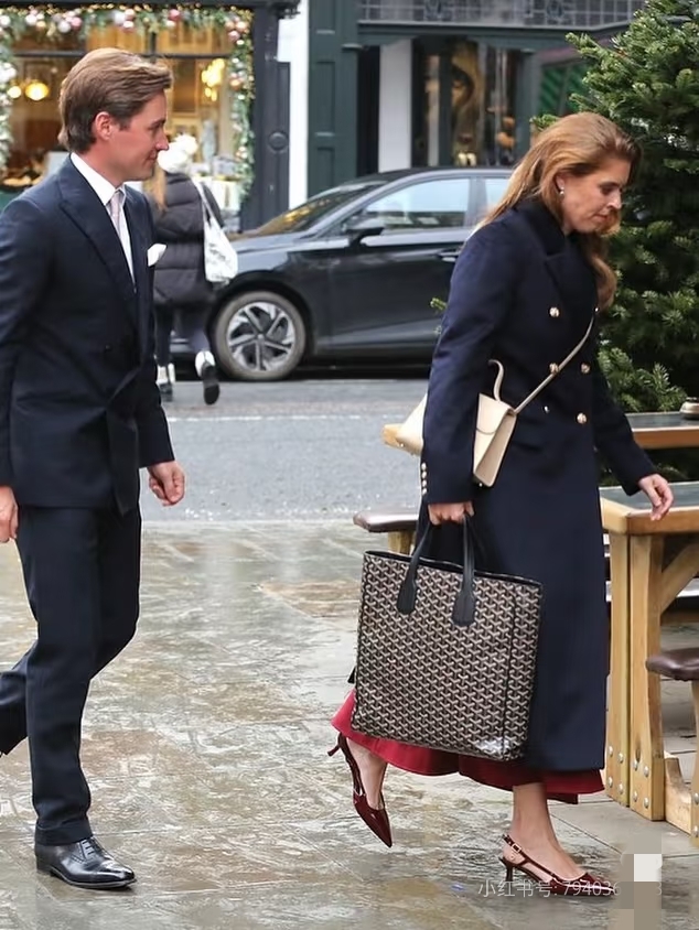 37岁的碧翠丝公主身穿一件LK Bennett深蓝色双排扣大衣,内搭红色连衣裙,脚踩一双酒红色露跟凉鞋。