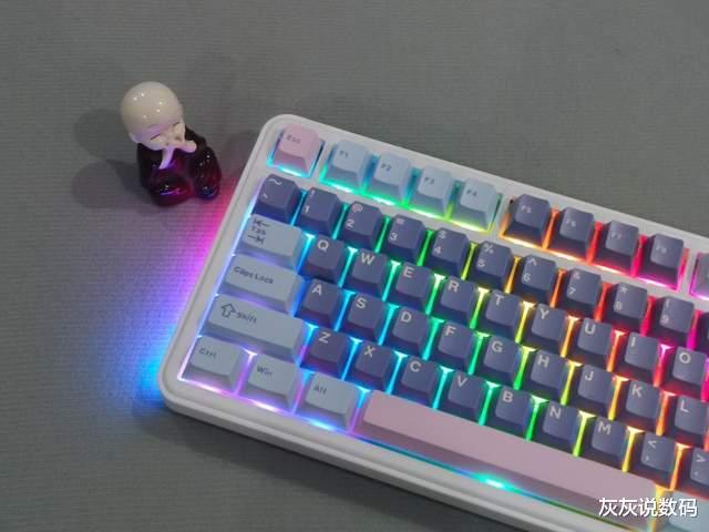 在实际使用中,按键触发压力适中,回弹迅速,长时间码字或游戏操作都能提供舒适的手感,有效缓解手部疲劳,按键的声音很小,即使在办公室使用也不用担心影响到别人。键盘支持全键RGB灯效,通过Fn+灯光键可切换十余种动态效果,如呼吸、流水、波浪等,灯光亮度均匀柔和,可调节亮度。除了按键的RGB灯效,键盘侧边也有RGB灯带,在桌面上会投射出氛围光,颜值加分项明显。