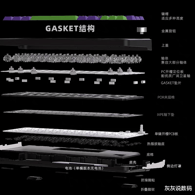 黑吉蛇YG75机械键盘在消音结构上,采用“gasket垫片+Poron夹心棉+底棉”的三重消音方案。gasket垫片有效吸收按键震动,Poron夹心棉填充在定位板与PCB板之间消除空腔音,底棉则进一步阻隔底部杂音。实际体验中,敲击键盘时杂音控制出色,声音干净沉稳,没有刺耳的空腔共振,属于客制化键盘中的优秀水平。
