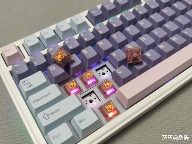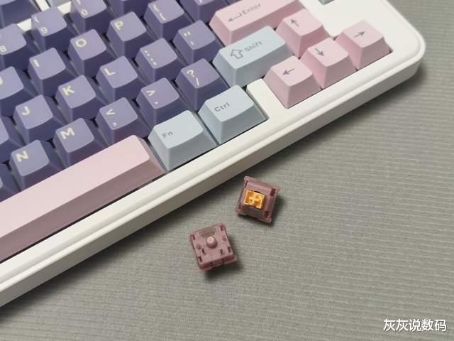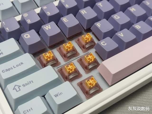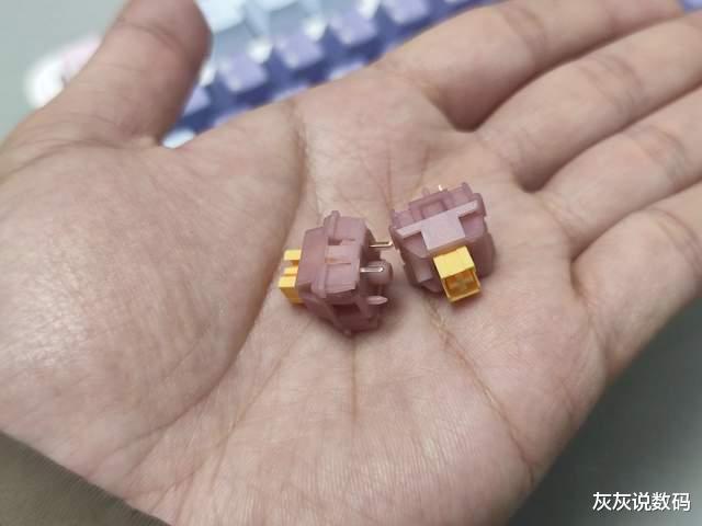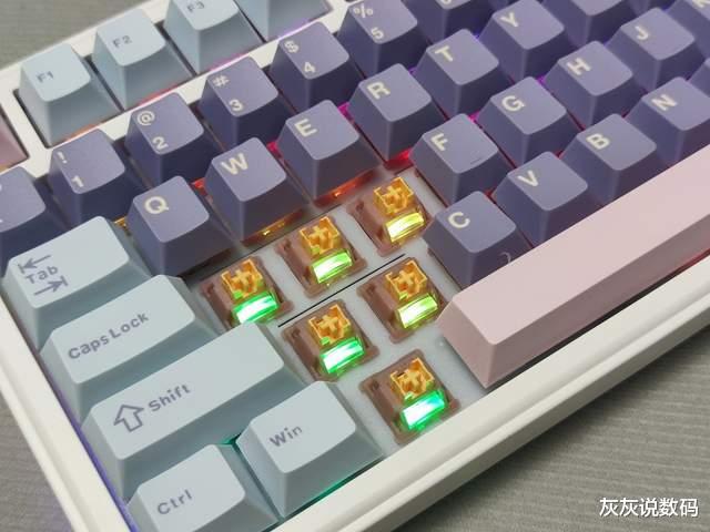 黑吉蛇YG75机械键盘在轴体方面,灰灰选择的是一款水蜜桃V3静音轴,这款轴体是5脚线性轴,外观美观,通体半透明粉白,搭配带有斜面的导光柱设计,外观颜值较高,且透光性好,能呈现出不错的RGB灯光效果。