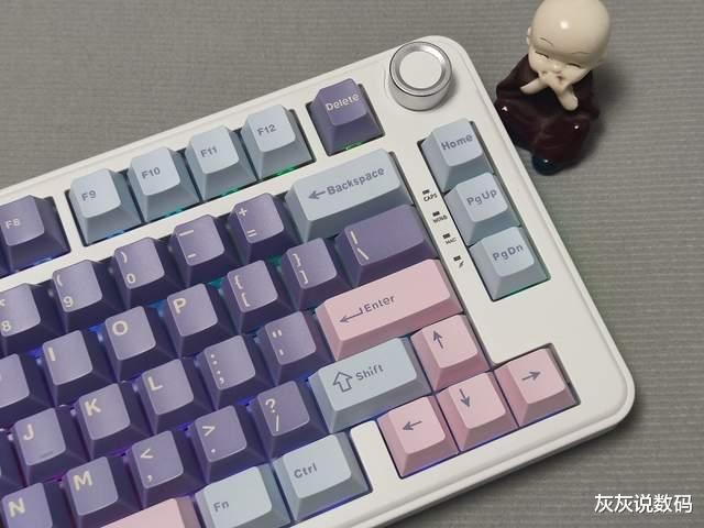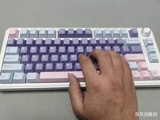 在配色方面,黑吉蛇YG75机械键盘提供了多种选择,适配不同用户的桌面风格,灰灰选择的是一款马卡龙配色的键盘。键帽采用PBT注塑工艺,字符耐磨不易褪色,表面带有轻微磨砂纹理,指尖摩擦力适中,长时间打字也不易打滑,触感体验优秀。细节设计上,键盘顶部设有USB-C接口和模式切换拨杆,支持蓝牙、有线、2.4G无线三种连接方式,底部配备两段式脚撑,可调节倾斜角度,搭配防滑硅胶垫,即便激烈游戏也能保持稳定不移位,实用性拉满。