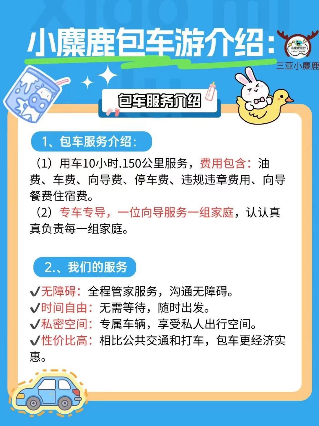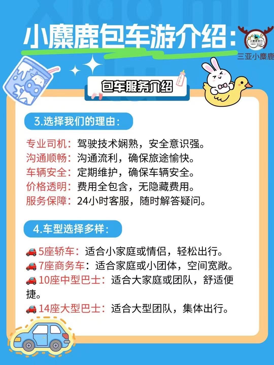 来三亚出游一定要选择包车自由行🚌。🌸【三亚旅行新体验】🚗 包车游,让出行更自由! 🌏 探索三亚,不再为复杂的交通线路烦恼。选择包车服务,享受专属您的出行时光! - 🚖 三亚包车,您的专属旅行管家 在三亚旅行,公共交通虽然发达,但线路复杂,打车成本高昂。现在,有了包车服务,一切变得简单! 🌟 ✔无障碍:全程管家服务,沟通无障碍。 ✔时间自由:无需等待,随时出发。 ✔私密空间:专属车辆,享受私人出行空间。 ✔性价比高:相比公共交通和打车,包车更经济实惠。 🌟 选择我们的五大理由 专业司机:驾驶技