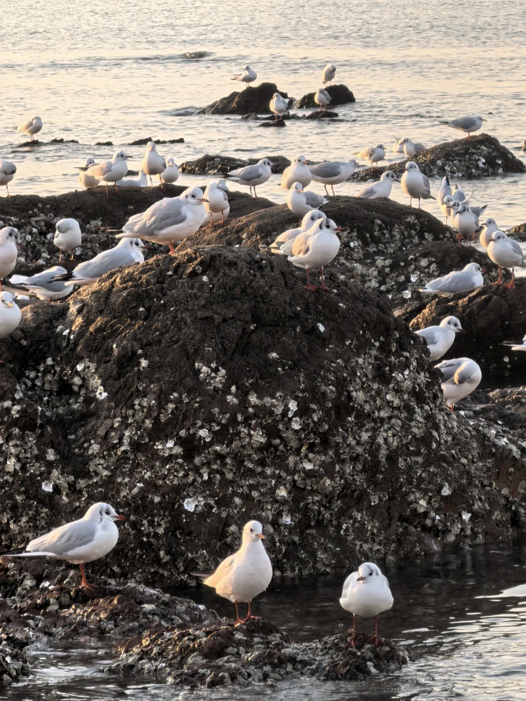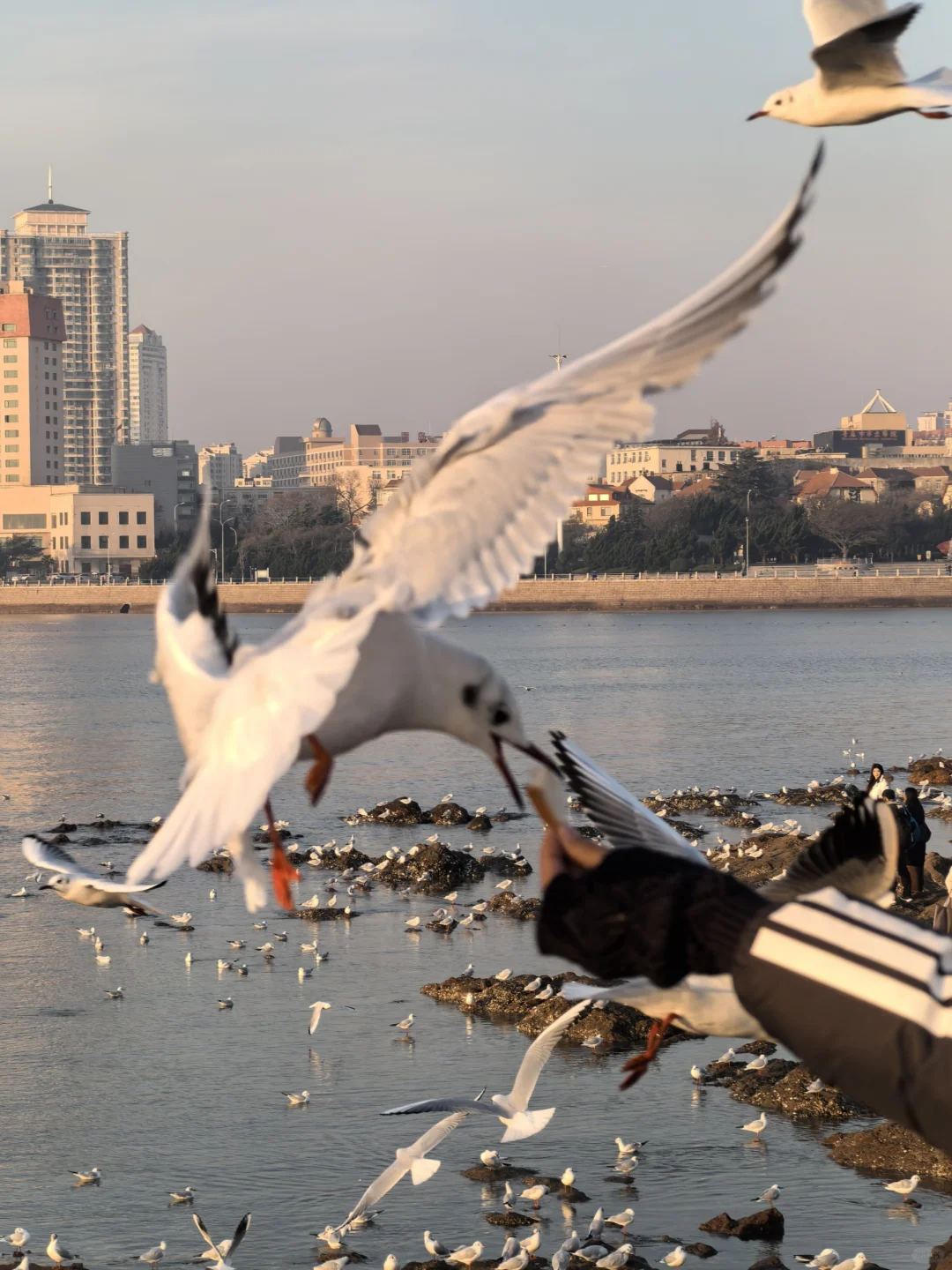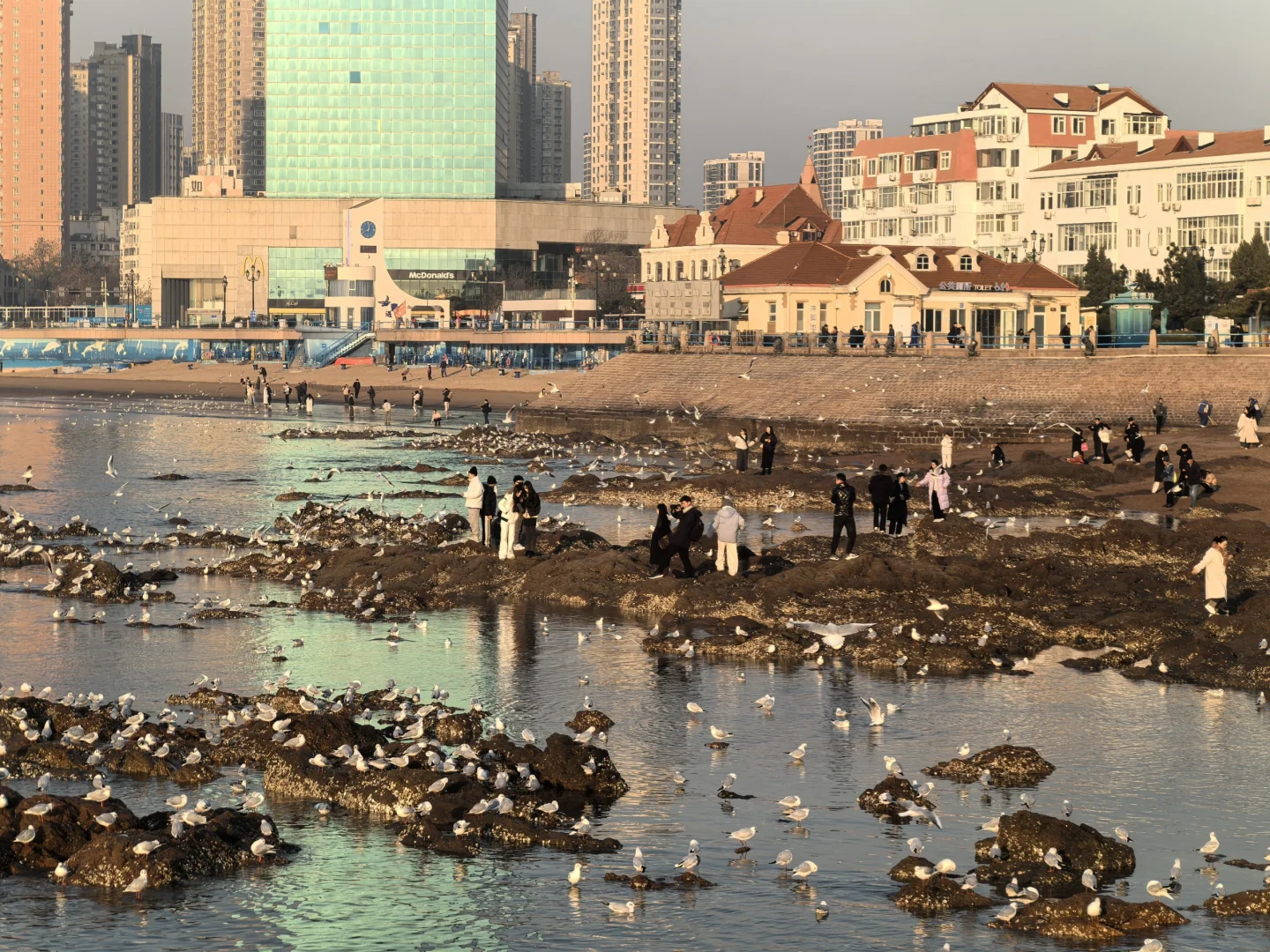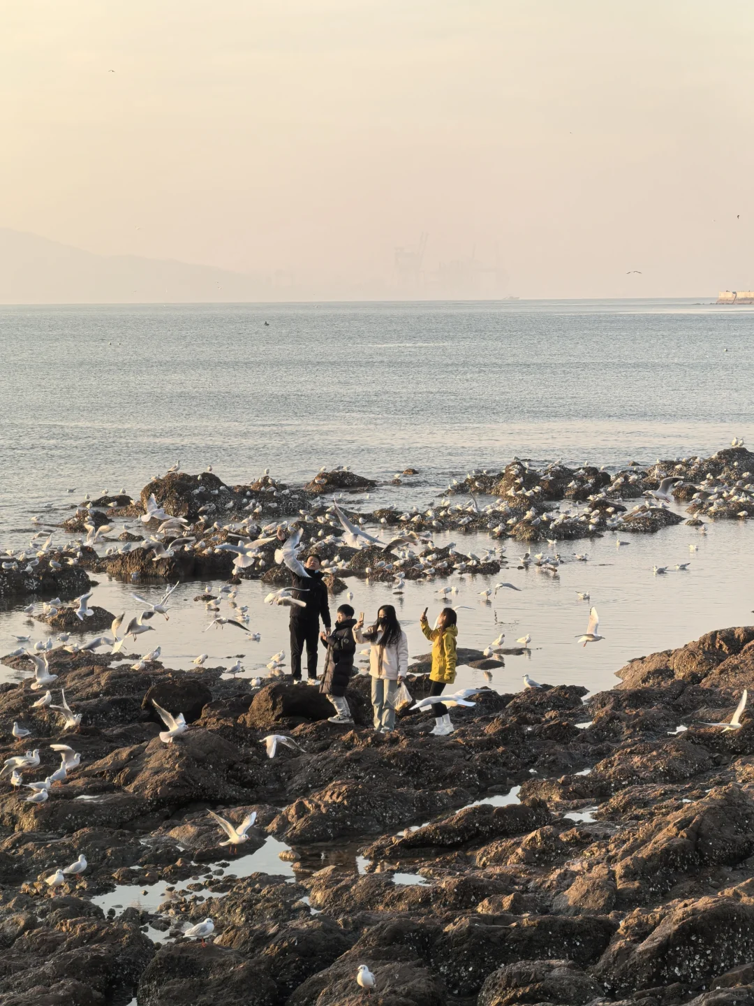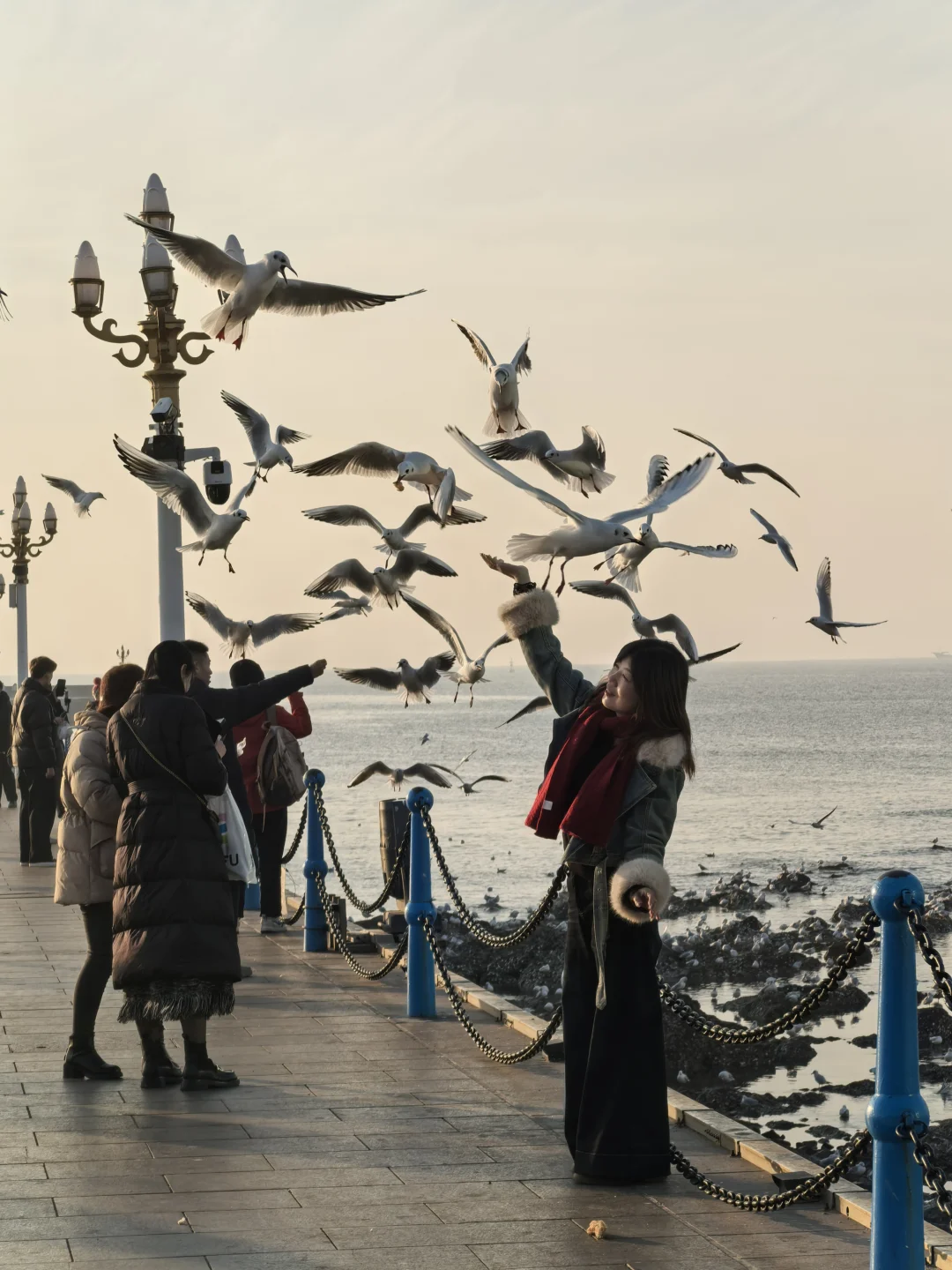 天暖和,人很少,海鸥很多。无风。因此,大衣羽绒服均可。
