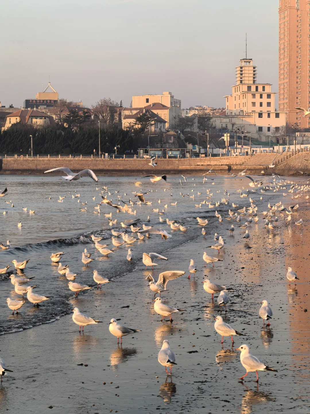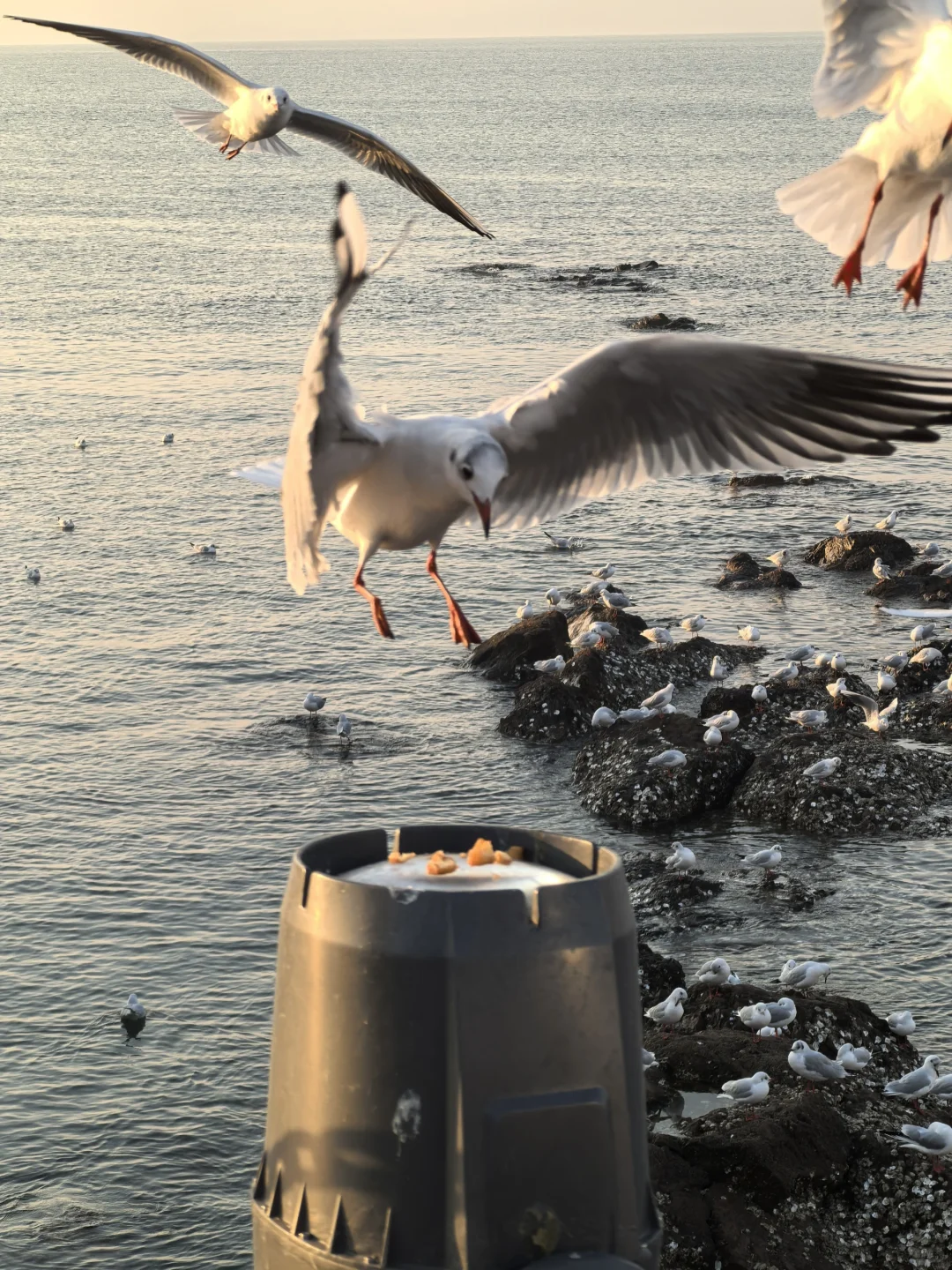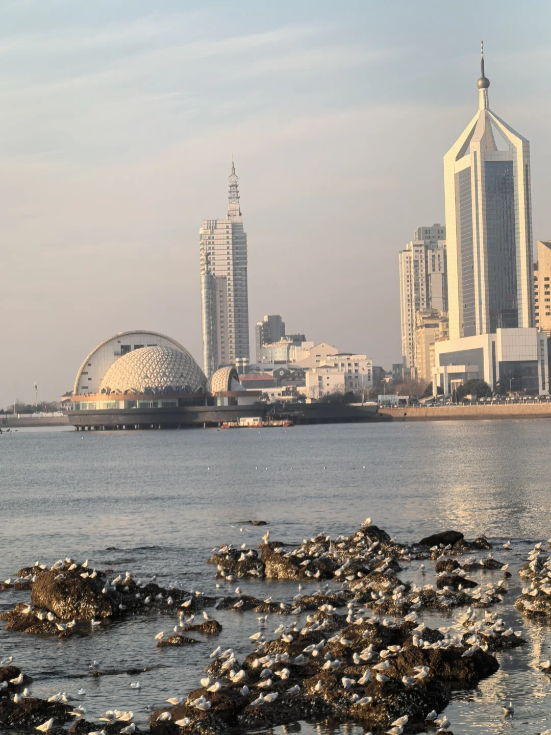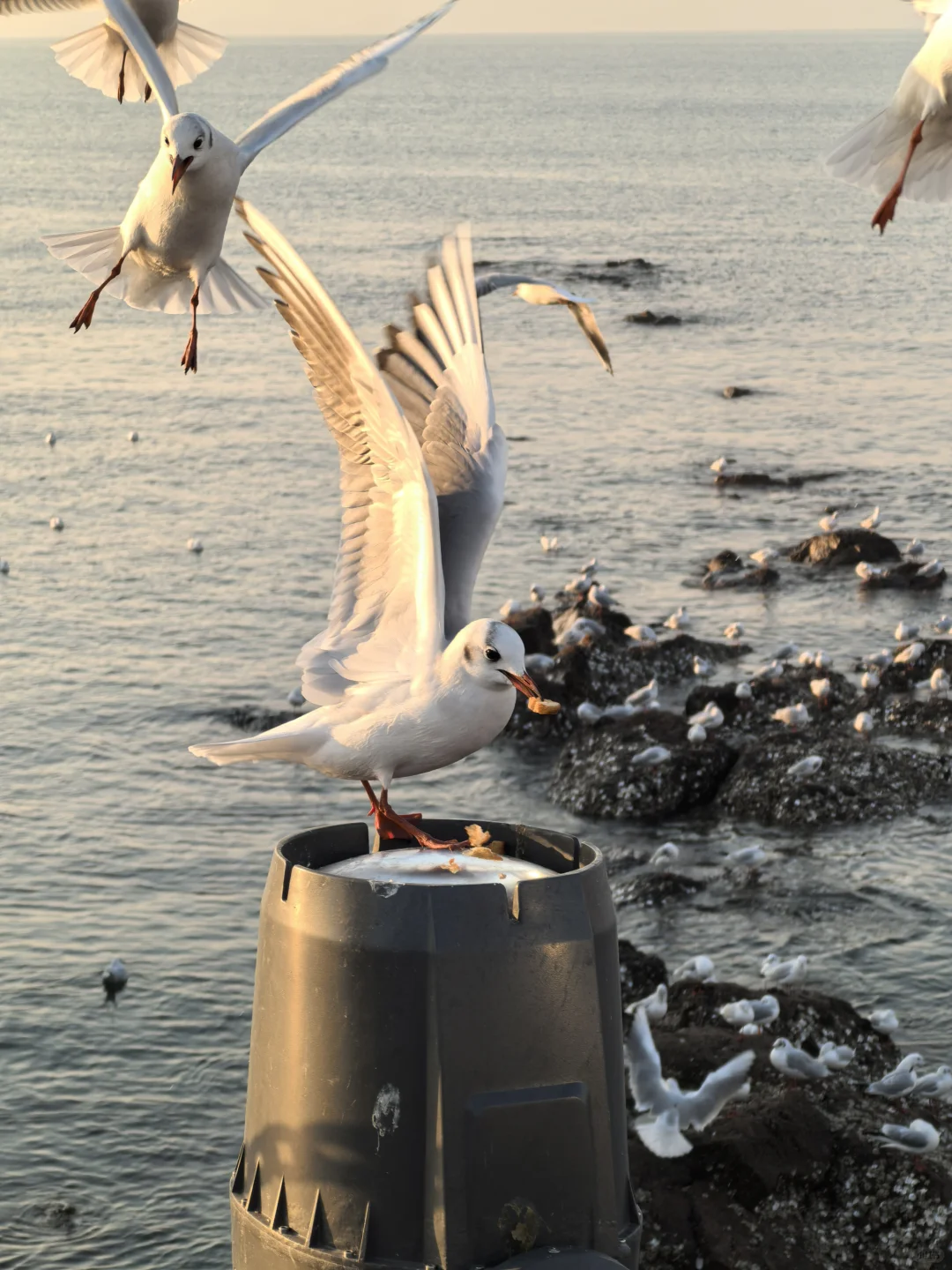 天暖和,人很少,海鸥很多。无风。因此,大衣羽绒服均可。