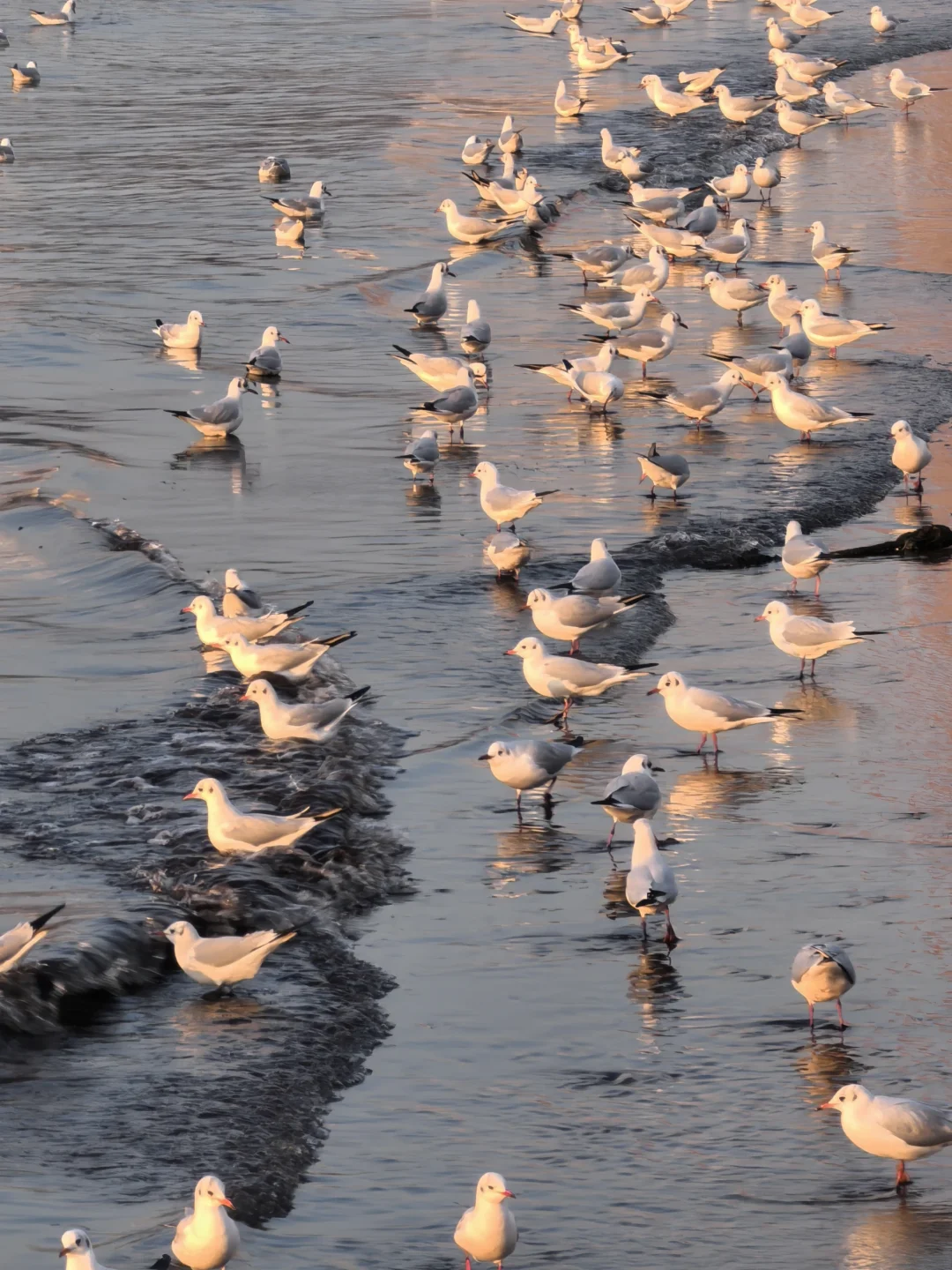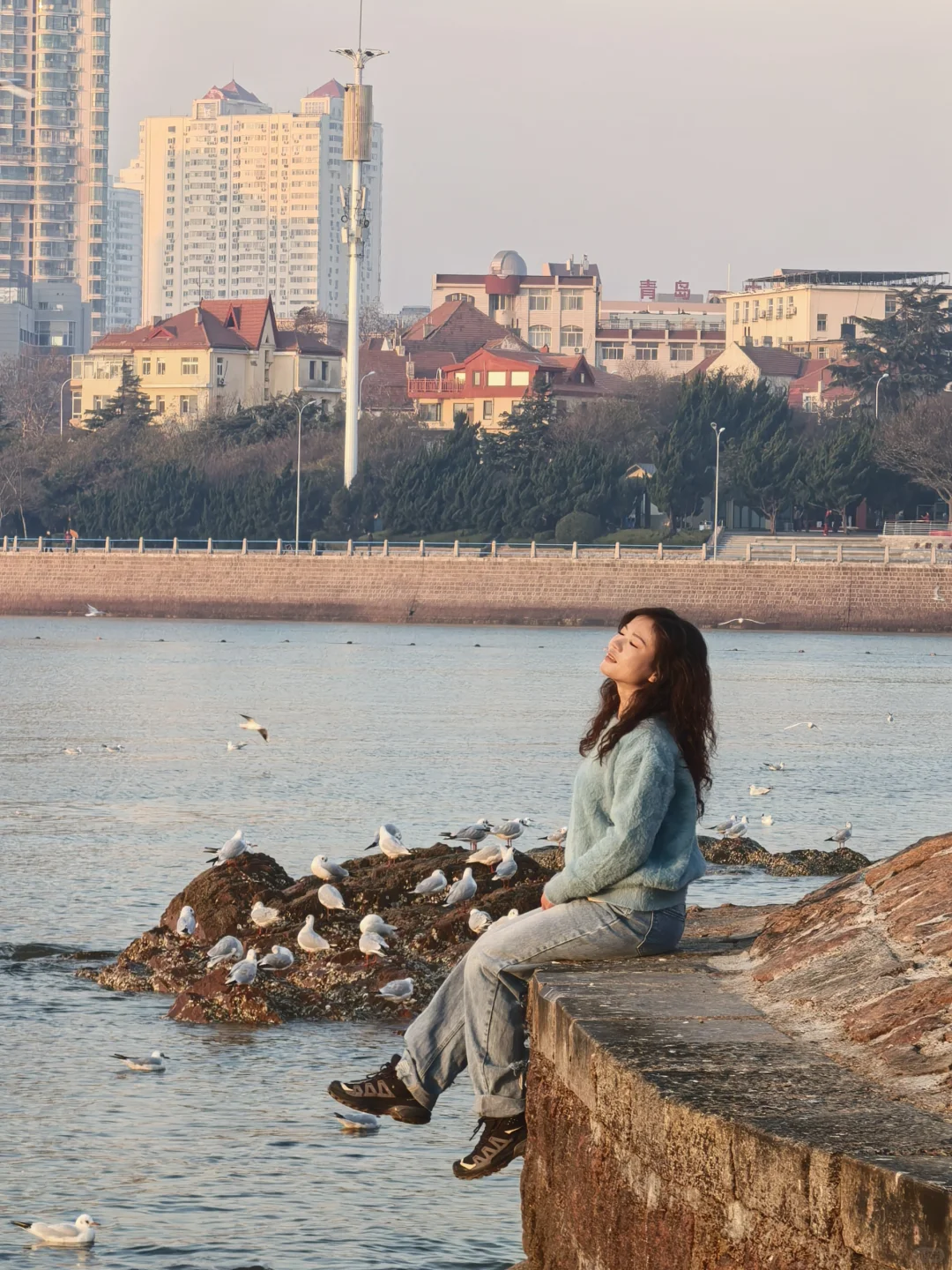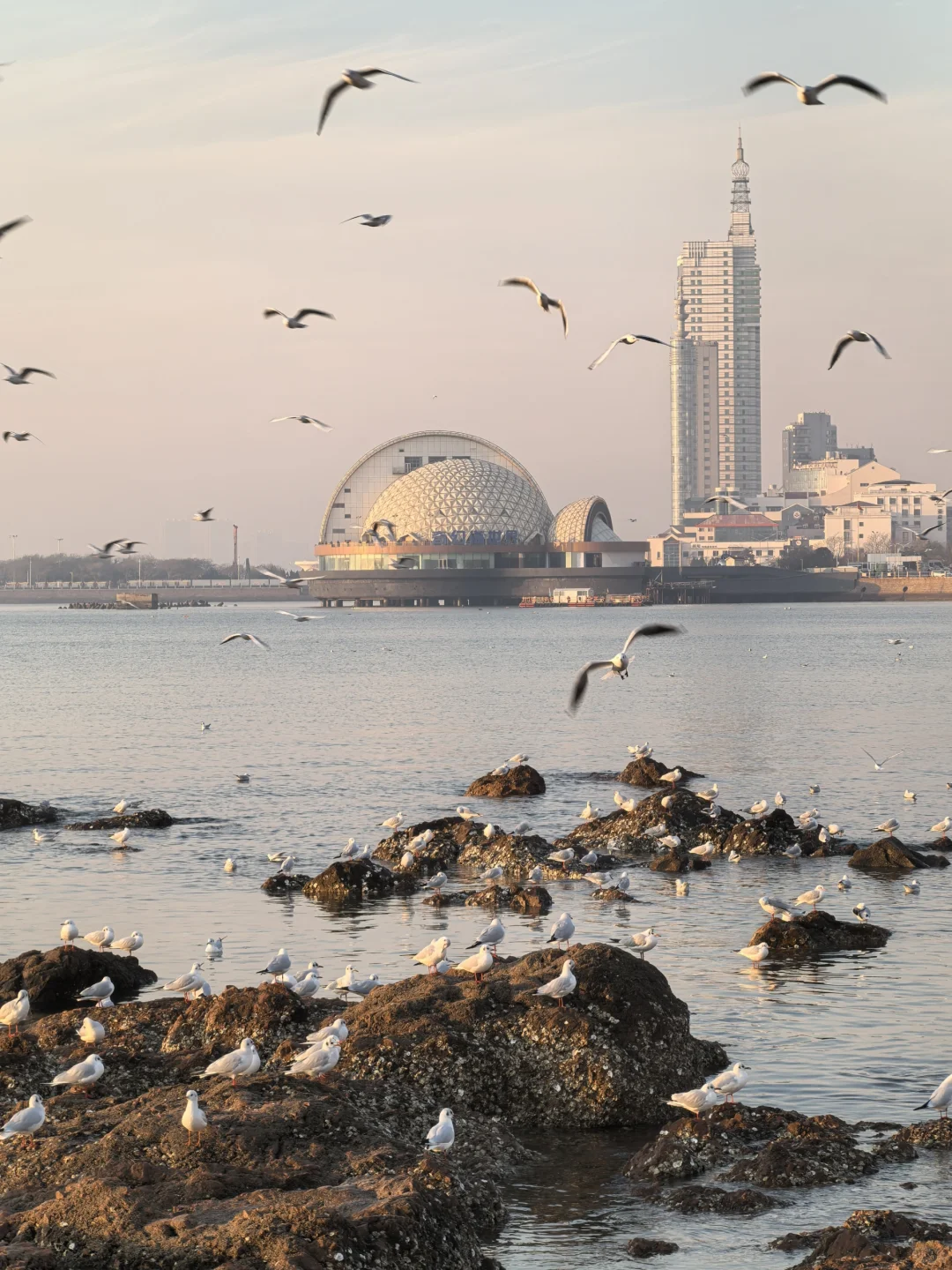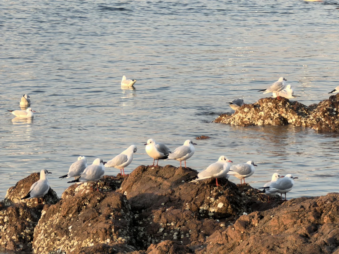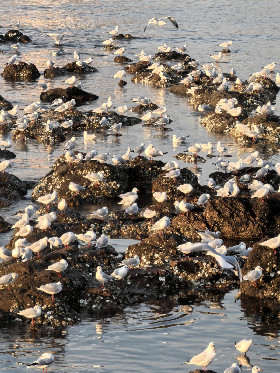 天暖和,人很少,海鸥很多。无风。因此,大衣羽绒服均可。