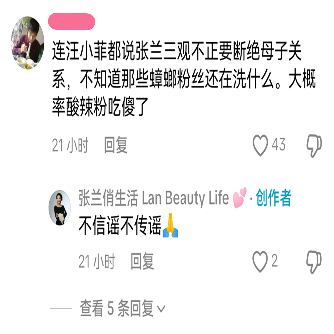 更有网友直接吐槽:“连汪小菲都说要跟你断绝母子关系了,你还出来营业干什么?”对此,张兰的回应依旧是四两拨千斤:“不信谣不传谣。”没有正面回应和儿子目前的感情状况。