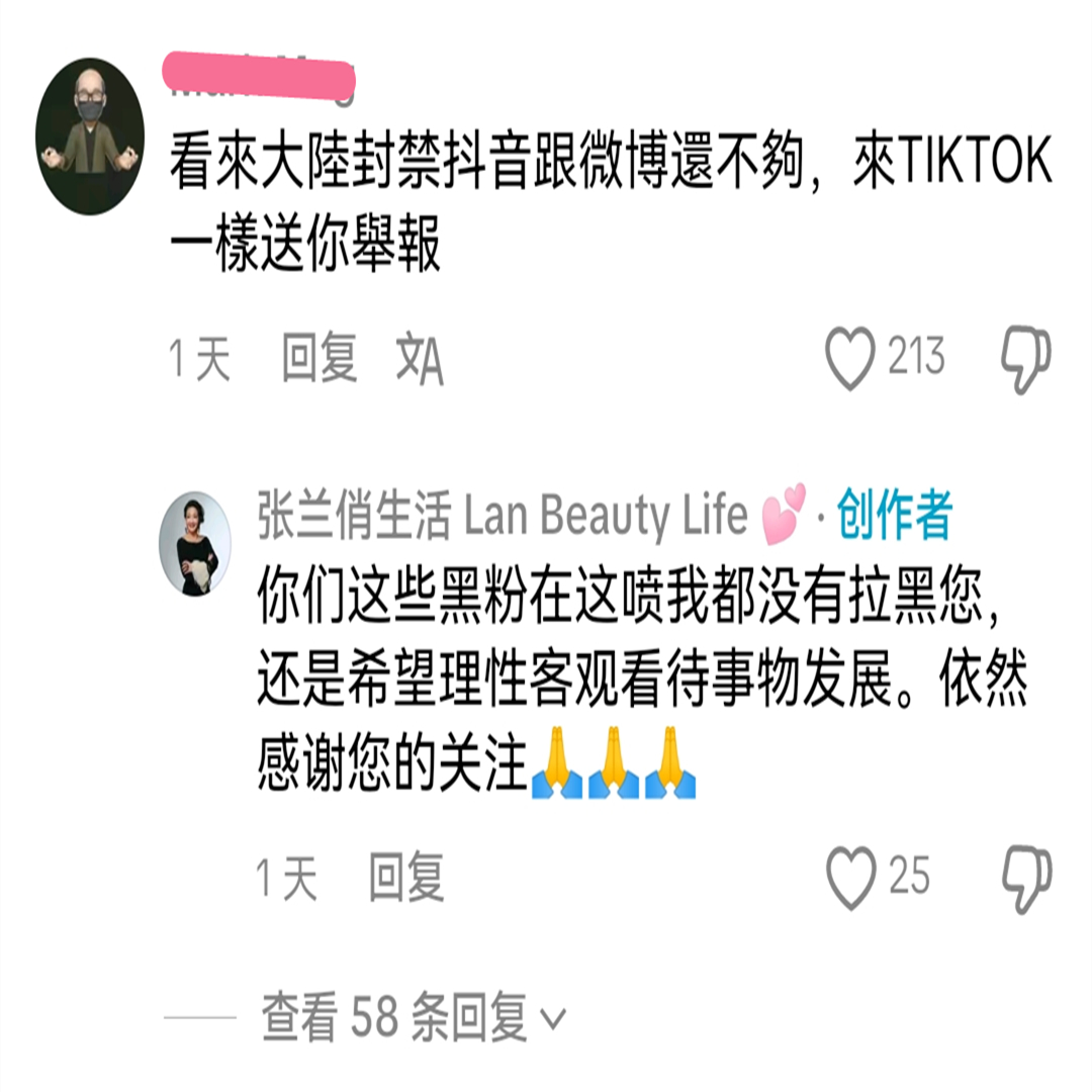 不过,海外网友的反应却是两极分化。有人力挺张兰,认为她是个“打不倒的女强人”;也有人表示反感,甚至留言会去举报,直言“不想再看她吃人血馒头”。面对这些攻击,张兰竟然罕见地亲自回应:“黑粉我没有拉黑你,是希望你能理性看待事情。”