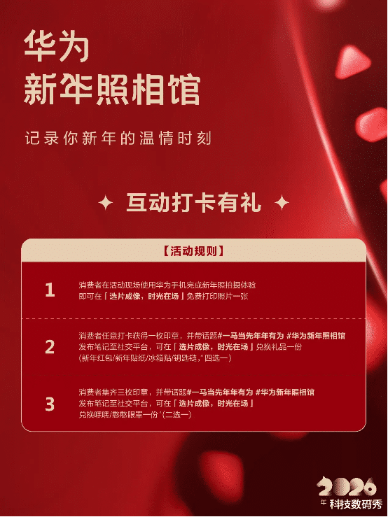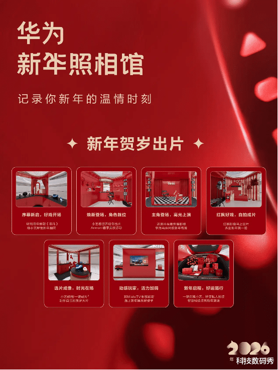 如果你也在纠结去哪拍大片,那这份攻略一定要收好。2026年1月24日起,华为新年照相馆将在全国陆续开馆,七大展区融合了趣味互动与智慧体验,为你营造一个充满科技感与仪式感的沉浸式空间。