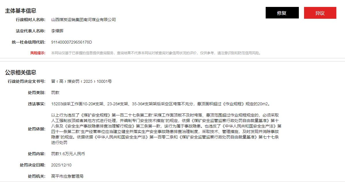 安全生产是煤矿行业的“生命线”,哪怕是支护细节的疏漏,也可能酿成无法挽回的安全事故。2025年12月10日,高平市应急管理局向山西煤炭运销集团南河煤业有限公司下达行政处罚决定书(晋﹝高﹞煤安罚﹝2025﹞10001号),该企业因15203综采工作面支架垮落不充分的重大安全隐患,被处以1.6万元罚款。这张罚单看似金额不大,却撕开了煤矿生产中“细节忽视酿隐患”的现实痛点,为煤炭行业安全生产再敲警钟。