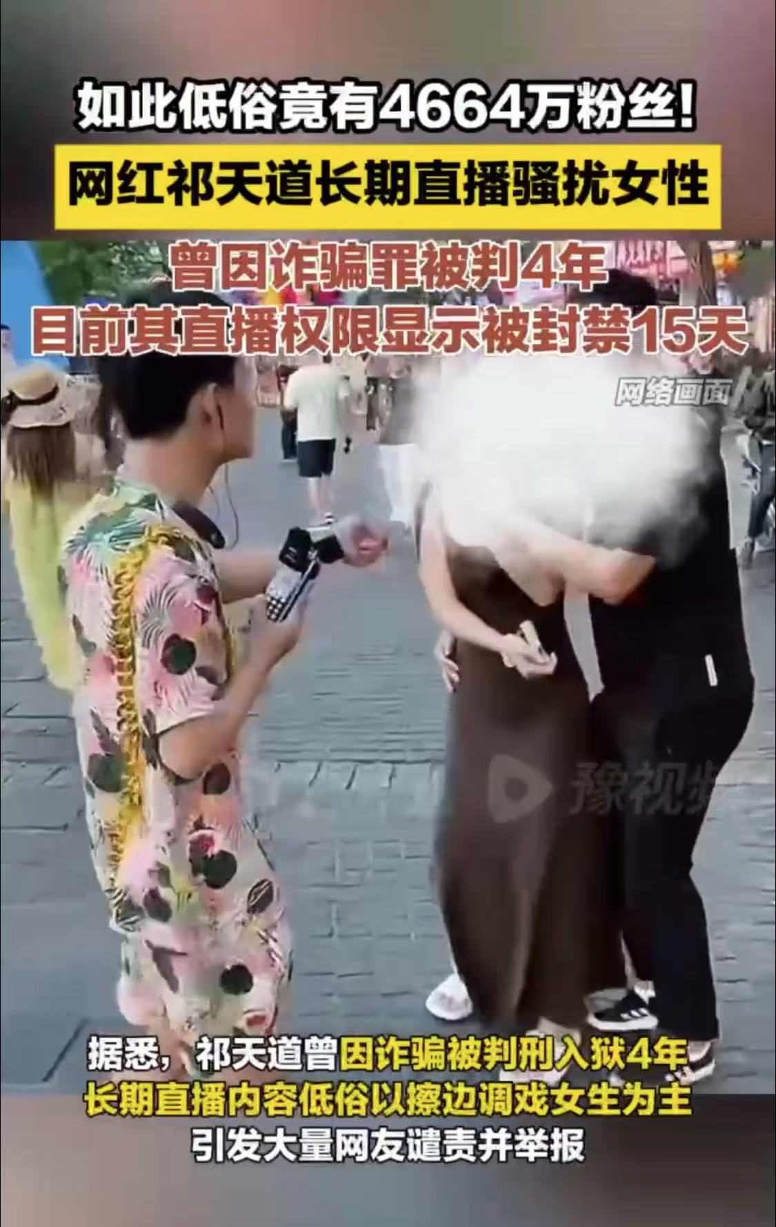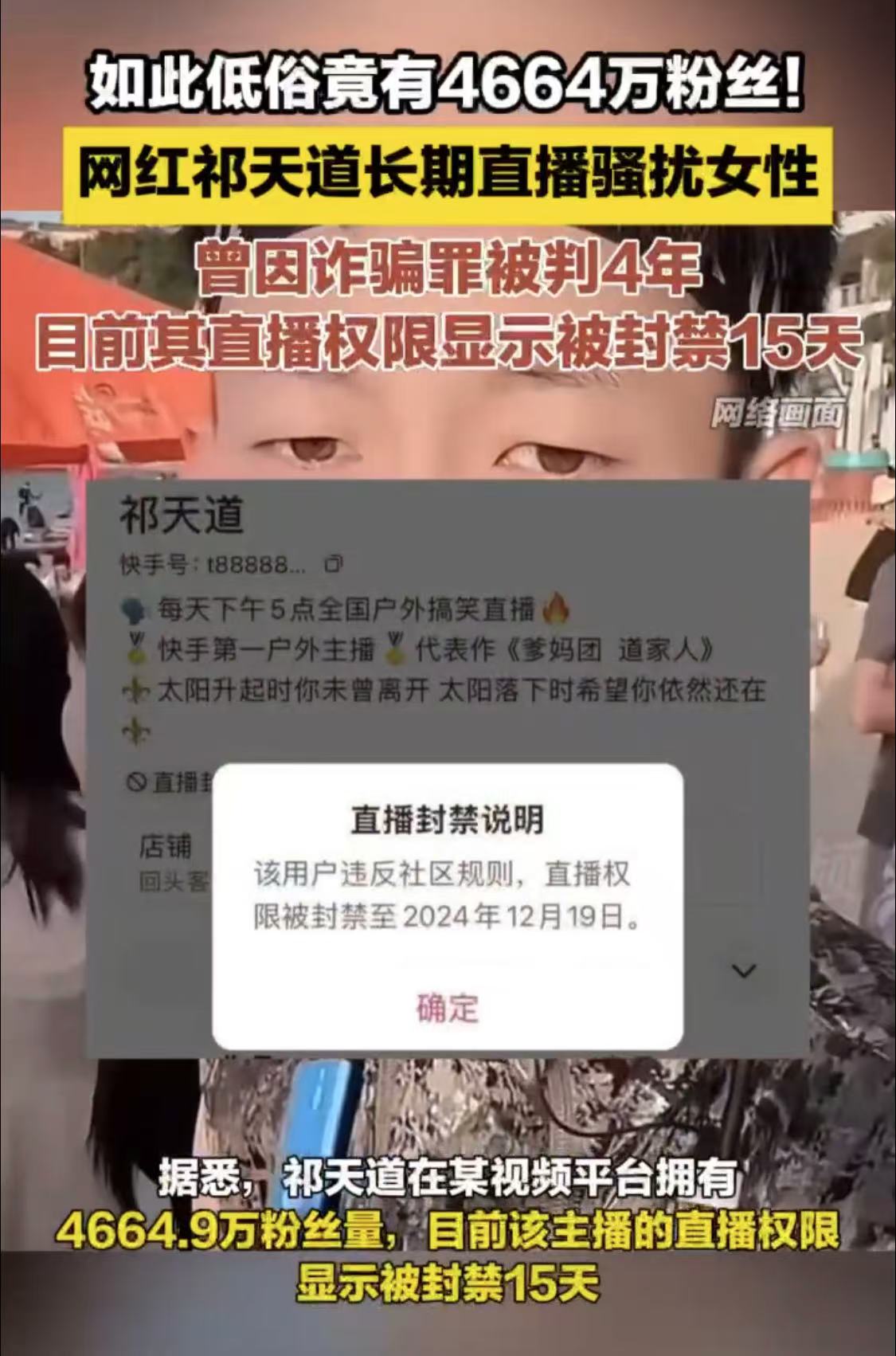 如此低俗竟有4664万粉丝网红祁!天道长期直播骚扰女性,曾因诈骗罪被判4年,目前其直播权限显示被封禁15天