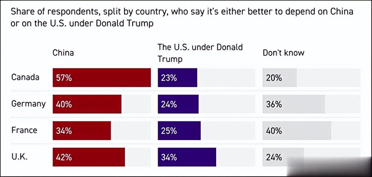 恰在同日,一份横跨英美两国的民意调查数据揭晓:加拿大境内高达57%的民众断言中国的可靠程度胜过美国,德国、法国、英国三国的统计结果更为惊人,对中国的认可度呈现压倒性优势。