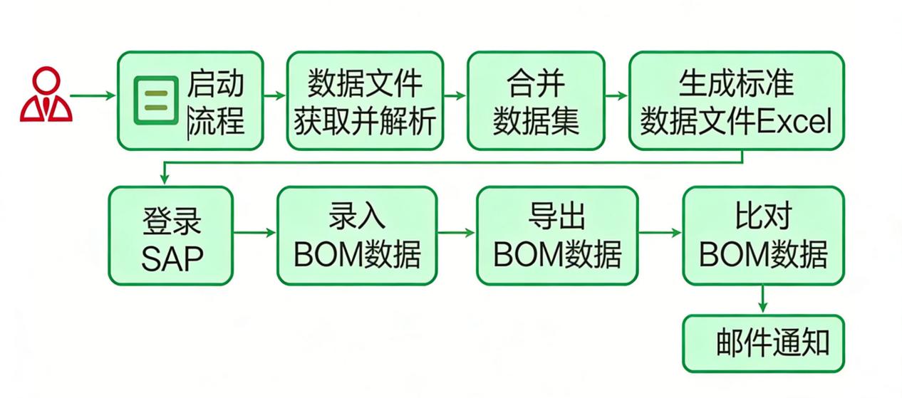 BOM作为制造核心数据,散布于ERP、MES、PLM等多个系统,传统人工从Excel或PDF中汇总录入耗时长、易出错。RPA能够自动解析各类文件、批量录入系统并进行版本比对校验。千条级BOM数据的处理时间可大幅缩短,准确率接近100%。