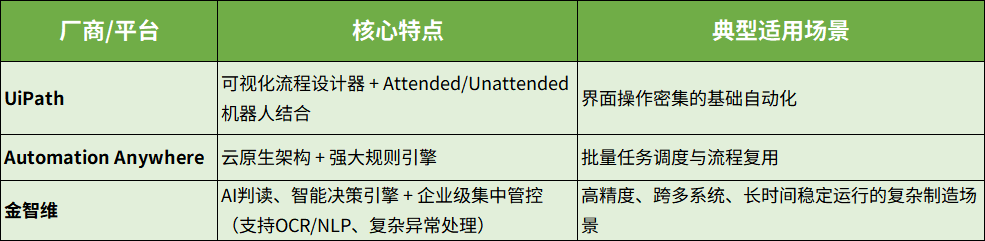 不同RPA平台在技术路径和适用场景上各有侧重: