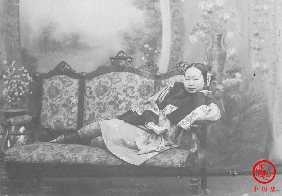 这位年轻女子在照相馆里摆pose拍照,她斜躺在沙发上,手里拿着书,表现出有文化的样子。她的脸型圆润丰满,有点婴儿肥,给人以很有福相的感觉。那个年代,她的模样可能会吸引很多媒婆来介绍对象。
