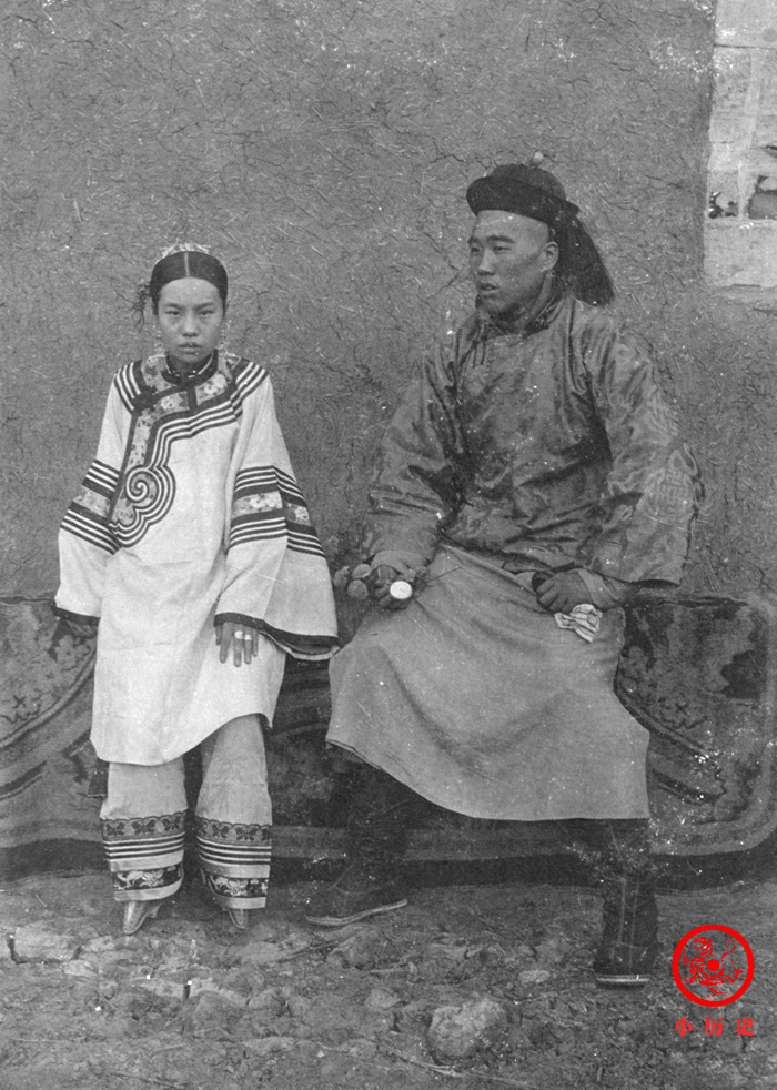 这对夫妻穿着干净整洁的服装,家庭经济条件应该不错。妻子裹小脚,身体在宽大的袄子下显得很瘦弱;丈夫戴暖帽、穿官靴,似乎是一个低级官吏,手中特意拿了一块怀表,展示自己新潮又有钱。