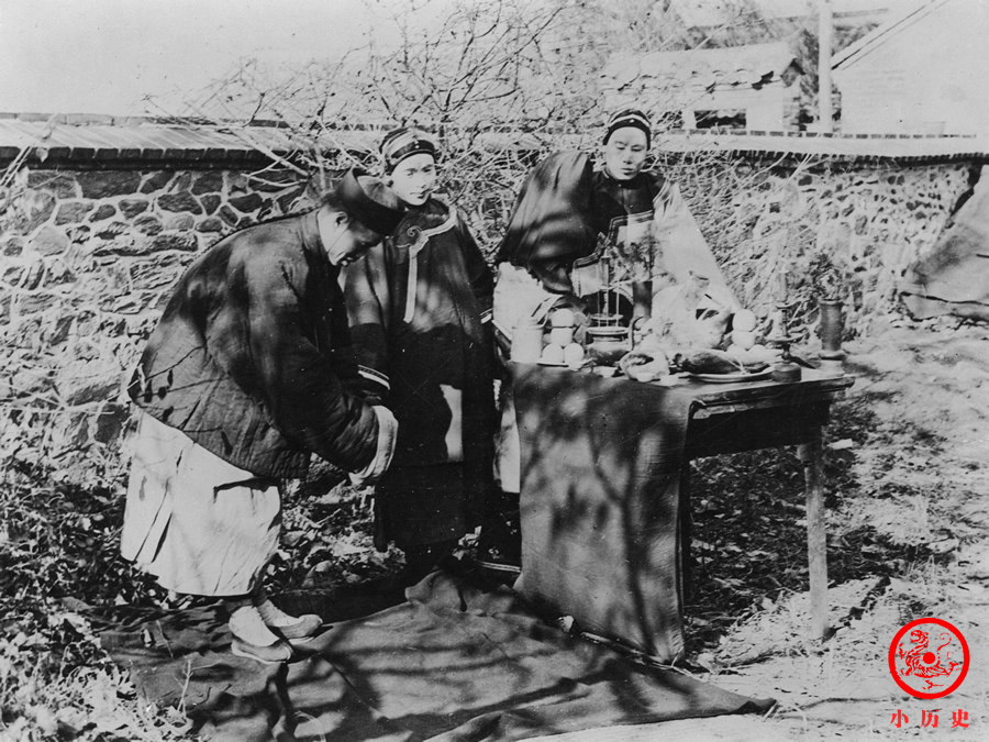 这是一张非常珍贵的老照片,保存了晚清婚俗的一个细节。大喜之日,一对新人在喜娘(由男方聘请,她们能说会道,善于应酬,主要职责是安排结婚礼仪)的安排下,举行拜天地仪式。院子里设供案、置香烛、摆贡品,选定良辰吉时,按当地习俗行礼如仪。画面中新娘顶着红盖头,新郎正在向神位作揖。