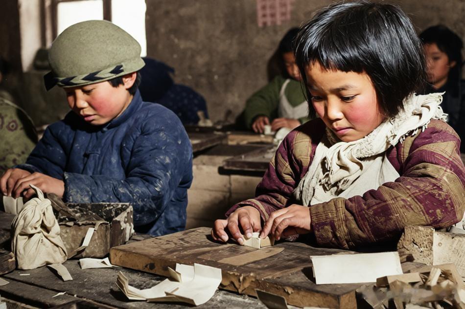 1945年,张家口市,两名儿童在一家火柴厂的车间内从事手工劳动,主要工作是切割、整理火柴梗(木条)或糊制火柴盒等工序。桌上散落着纸张、木条和工具,环境简陋、尘土飞扬。火柴制造业在当时是常见轻工业,但生产过程(如接触磷、氯酸钾等化学品)对健康有害,尤其对儿童。