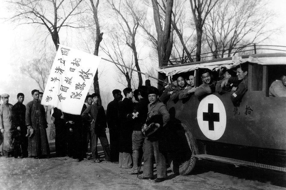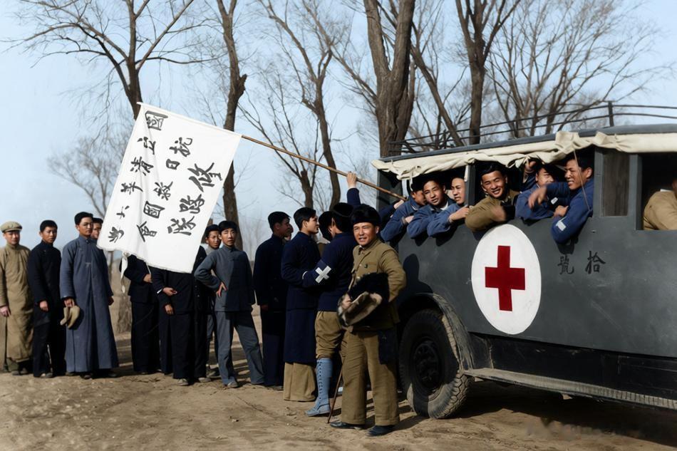 带红十字标识的车辆旁,身着长衫、棉服的学生们或围站路边,或探出车篷向外张望,他们组成的修路队,是要赶往前线协助工兵修整道路,保障抗战前线的交通运力,以务实行动支援长城抗战。