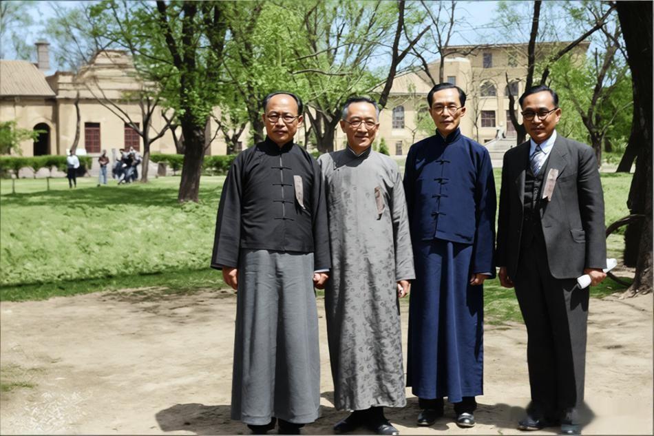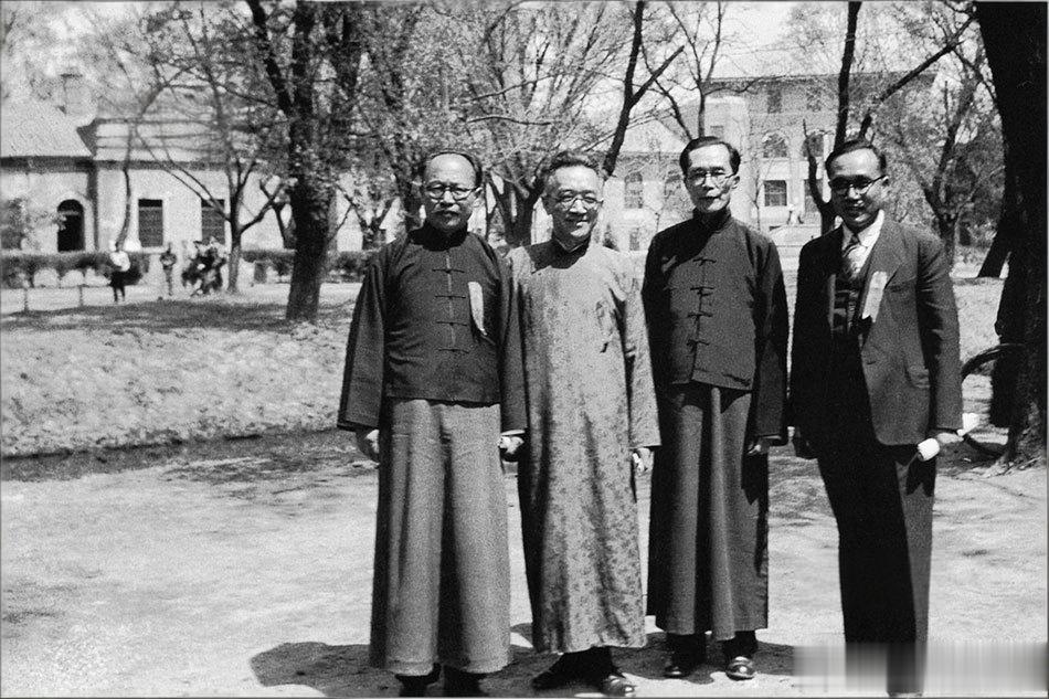 1947年,北京清华园,清华大学36周年校庆期间。照片四位人物从左至右分别为:查良钊(原西南联大训导长、时任昆明师范学院院长),、胡适(时任北京大学校长)、梅贻琦(清华大学校长)、黄钰生(南开大学秘书长)。
