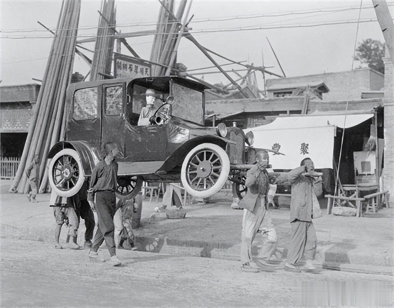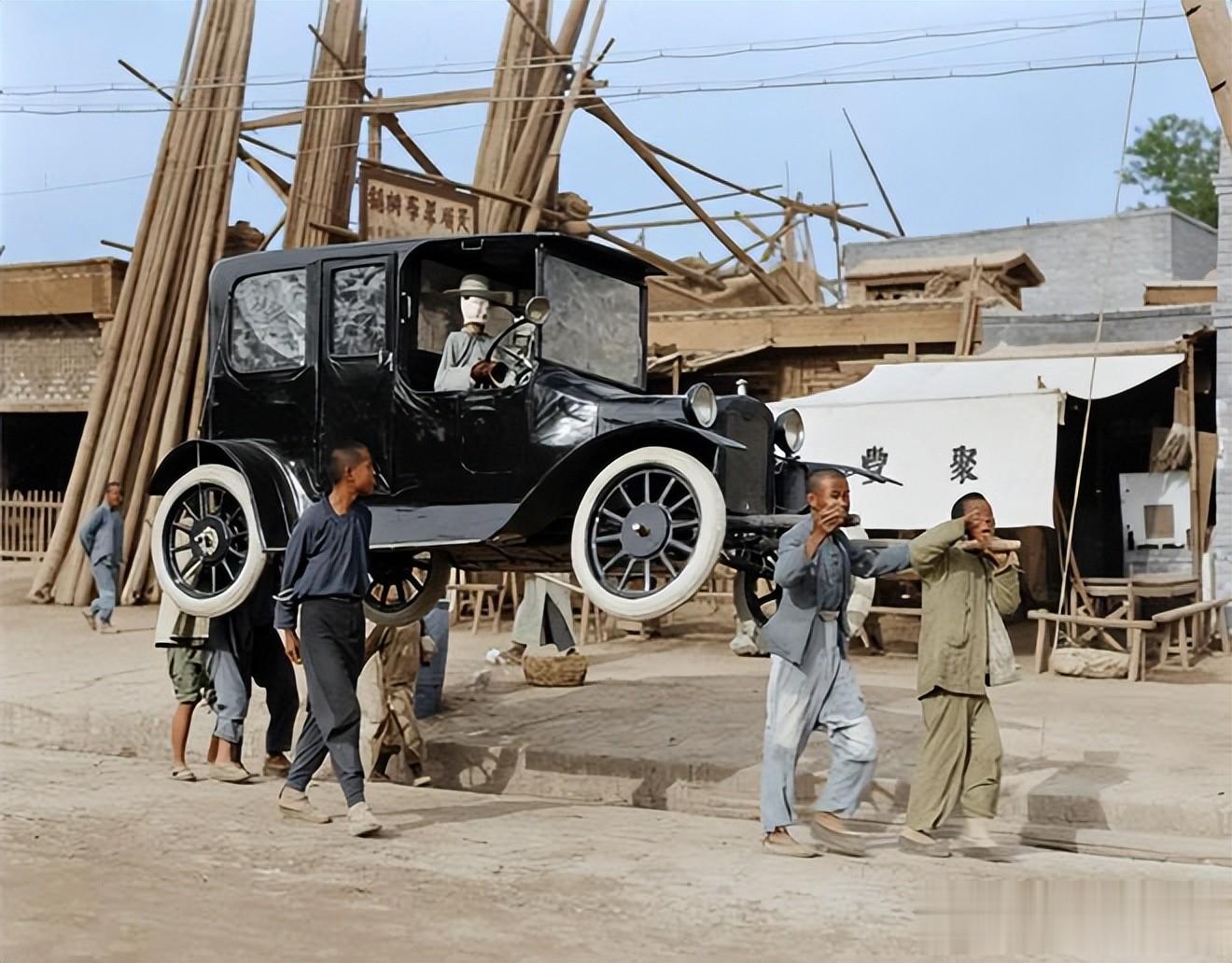 几个穿粗布短衫的汉子弓着肩,把这纸扎汽车稳稳架在肩头,裤脚沾着尘土,鞋帮磨得泛白,是老城巷弄里常见的力夫模样,脚步沉缓,衬着葬礼的肃穆。后面堆得老高的木材棍斜支着,旁侧棚帘上 “聚” 字隐约露出来,是市井里的木料摊或杂货铺,烟火气裹着这 “西洋新奇” 的纸扎,让时髦的冥器落进了最朴素的民间日常。