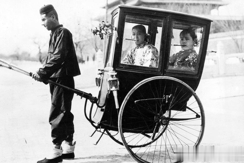 车内坐着两位年轻女性,头上插戴鲜花作为装饰,这在当时是时尚的打扮,尤其流行于都市女性。两人均叼着烟卷,姿态休闲而大胆,上海或北京的摩登女子、社交名媛或娱乐圈人士受西方影响,公开抽烟已成为一种时髦象征。